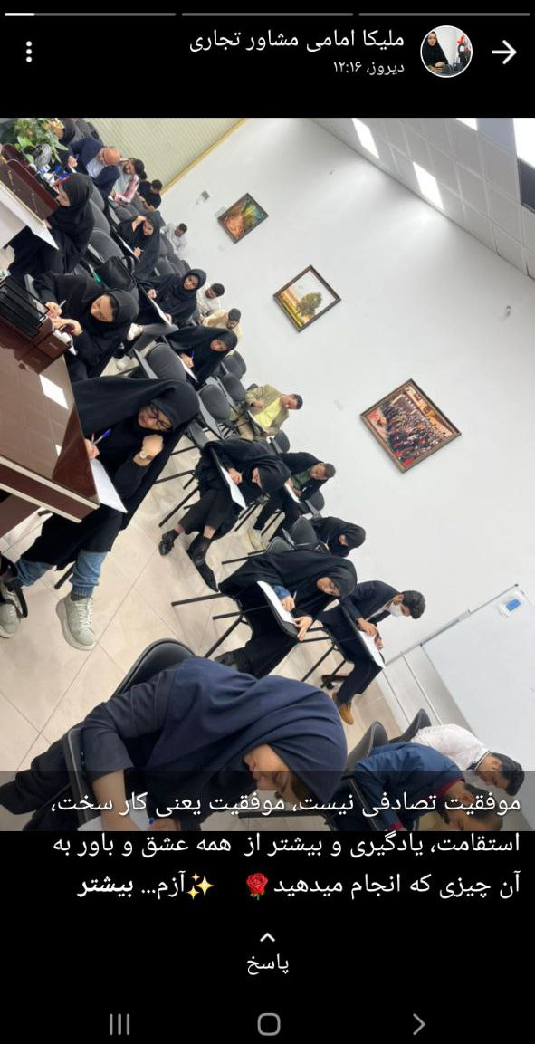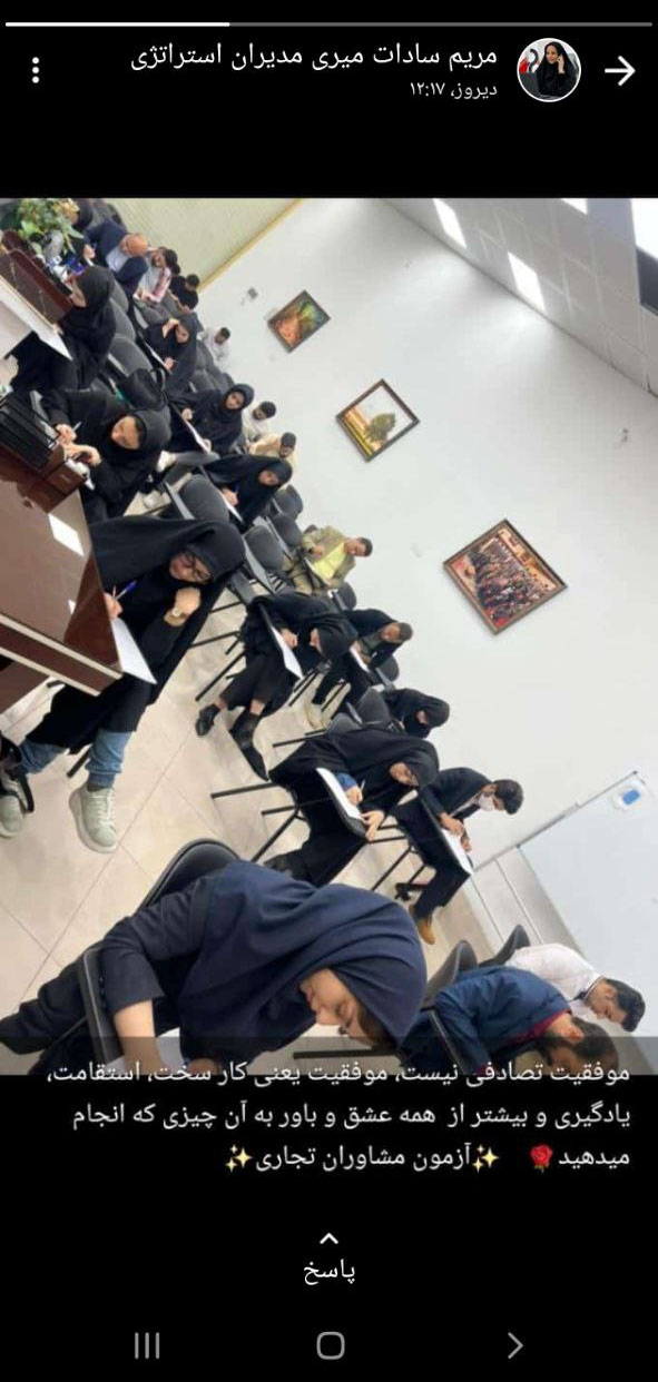 مریم سادات میری از مدیران تجاری مجموعه، تصویری از آزمون مشاوران تجاری را در وضعیت خود به اشتراک گذاشت.
