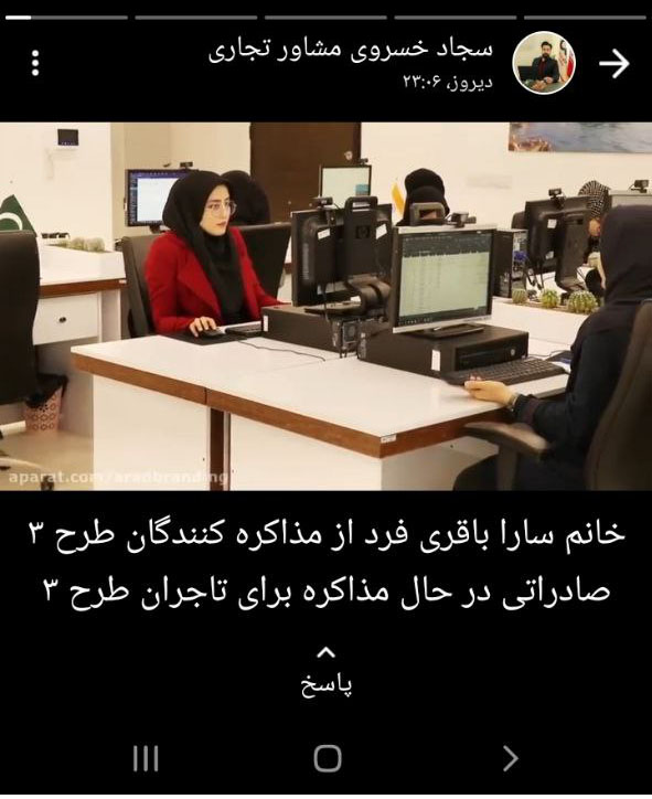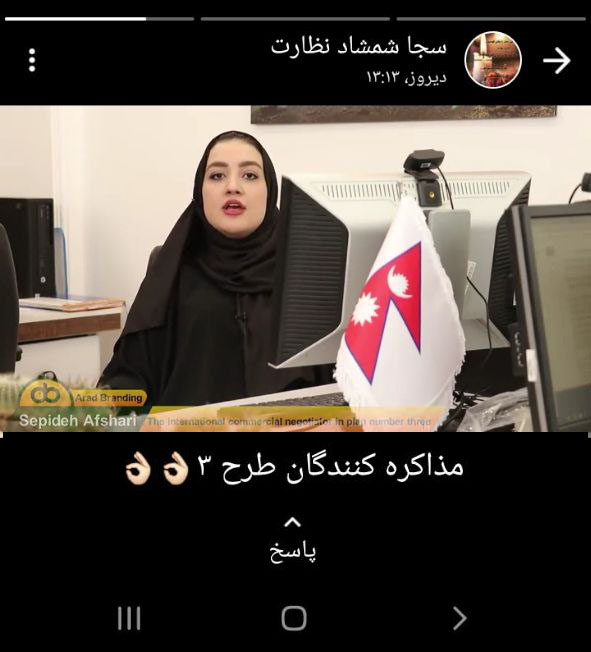 سجاد خسروی از مشاوران تجاری مجموعه، کلیپی در خصوص مصاحبه با مذاکره کننده بین الملل، خانم سارا باقری فرد را در وضعیتی قرار داد.