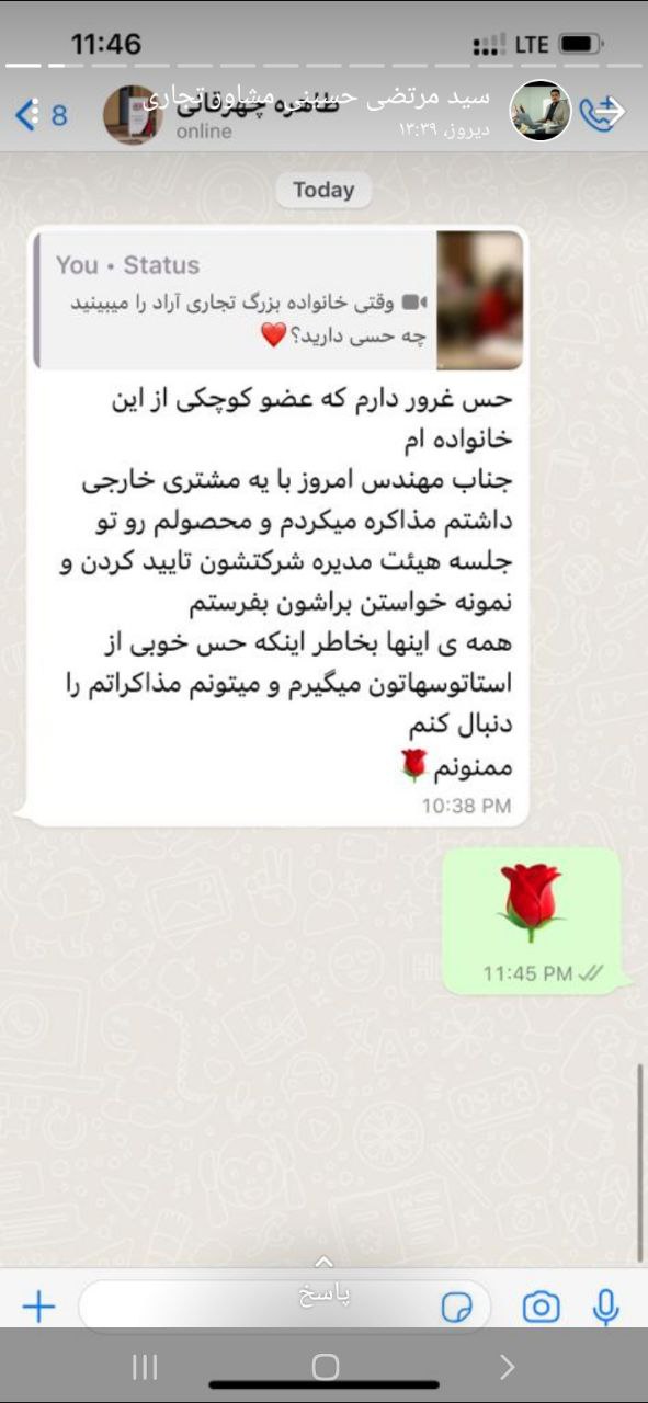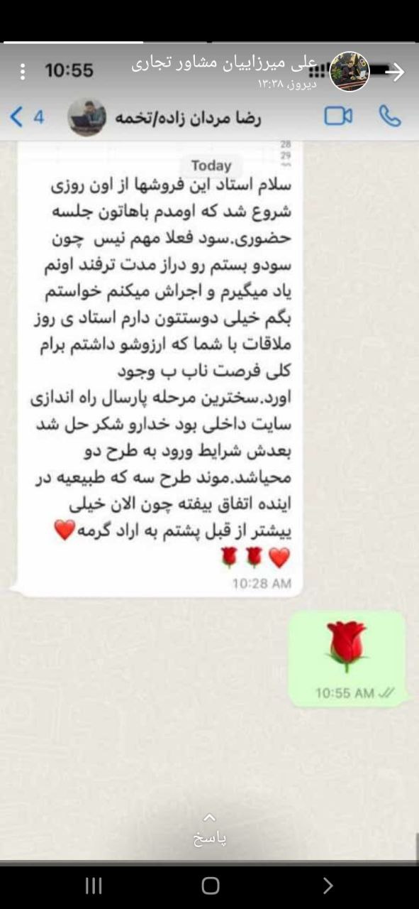 علی میرزاییان از مشاوران تجاری، پیامک محبت آمیز از تاجر عزیز مجموعه را در وضعیت واتساپ خود قرار داد.