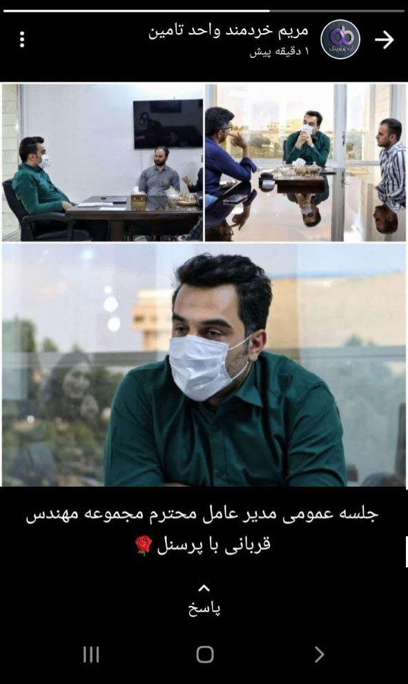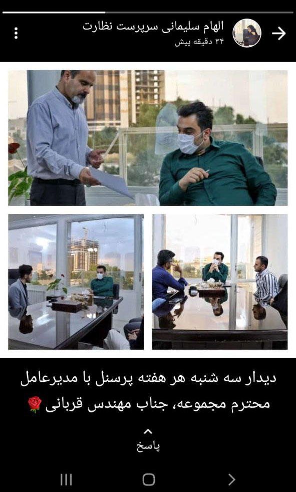 الهام سلیمانی سرپرست نظارت، عکسی از جناب مدیر عامل محترم در جلسه با پرسنل مجموعه را در وضعیت خود به نمایش گذاشت.