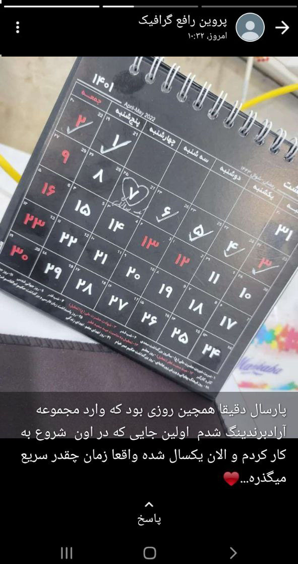 پروین رافع از بانوان فعال در بخش گرافیک، تصویری از سالگرد ورود خود به مجموعه را در استاتوسی به اشتراک گذاشت.