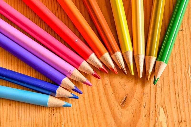 لوازم تحرير مداد رنگي در طیف های رنگی متنوع کنار هم قرار دارند.