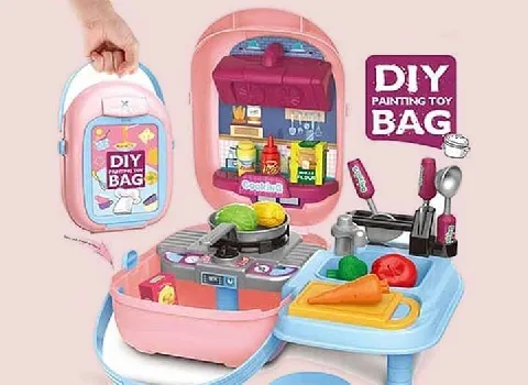 اسباب بازی دخترانه آشپزی شامل قسمت های مختلفی از قبیل اجاق گاز، سینک ظرفشویی، یخچال، کابینت و انواع ظروف و وسایل مورد نیاز برای آشپزی می باشد.