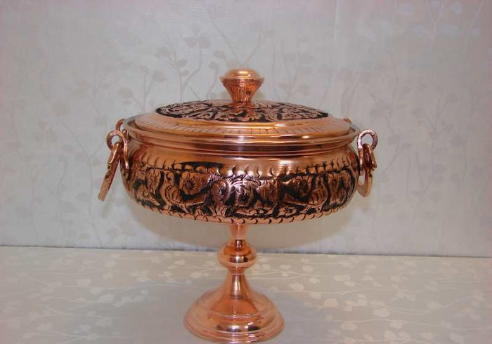 ما ایرانیها از آن در هنگام عید نوروز استفاده می کنیم و از آنجایی که دارای رسم و رسوم مهمانی در عید و دید و بازدید هستیم، به این گونه وسایل پذیرایی نیز احتیاج داریم و به دنبال نمونه های زیبا و چشم نواز آن می باشیم که ظروف مسی زیبایی خاصی در این میان دارند. یکی دیگر از مشخصات این ظروف ضخامت ورقه مسی کار شده در این ظروف می باشد که ممکن است ضخامت بالایی داشته باشند و در حد نیم میلی متر ضخامت داشته باشند که این ورقه ها توسط دستگاه پرس شکل داده می شوند و به راحتی نمی توان طرح و نقش بر روی آن به وجود آورد. ورقه هایی از جنس مس وجود دارند که ضخامتهای کمتری دارند و ظروف به وجود آمده از این ورقه ها امکان چکش کاریو قلم زنی بر روی آن هست و درای نقش و نگارهای مختلفی می باشند.