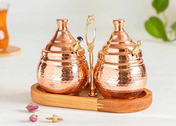 در حقیقت ظروف عسل مسی چکشی شده که توسط مسگران و هنرمندان ماهر زنجانی به شکل بسیار ویژه و زیبایی طراحی و تولید شده اند می توانند انتخابهای بسیار مناسبی برای جایگیری عسل طبیعی شما باشند. در واقع شما می توانید عسل زعفران مصرفی روزانه که روزانه بر سر سفره خود و در وعده صبحانه میل می کنید را در این ظروف ریخته و از استفاده نمایید. حتی می توانید از آنها به عنوان ظروف ادویه های پودر شده خود استفاده نمایید و نگران آسبیب به آنها نیز نباشید چرا که این ظروف توسط روکش نانو به خوبی مقاوم شده و در برابر هر گونه خط و خش مقاوم می باشد. در واقع این لایه ها نانو به دلیل رنگ ثابت شان در کوتاه مدت فرسوده نشده و رنگ خود را از دست نمی دهند به همین سبب می توانند تا مدتهای طولانی به عنوان بهترین ظروف شما و قوت قلب تان برای تان کار کنند.