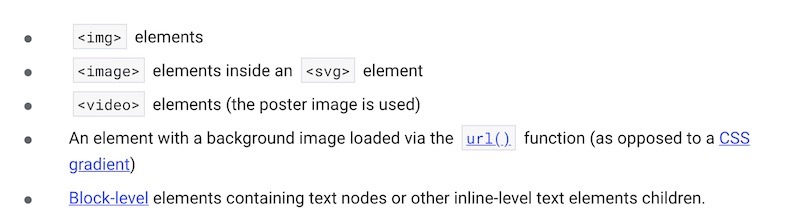 داشتن نمره رندر LCP شما در زیر ۲٫۵ ثانیه حاکی از بهبود است. بنابراین در صورتیکه LCP کمتر از ۲٫۵ ثانیه باشد، صفحه مد نظر شما از نظر LCP دارای وضعیت مطلوبی است و اگر بین ۲٫۵ تا ۴ ثانیه باشد، نیاز به اصلاحات وجود دارد و اگر LCP بیش از ۴ ثانیه بود، صفحه در وضعیت نامطلوبی قرار گرفته و بهتر است که هر چه سریعتر، بررسی های لازم در خصوص Largest Contentful Paint انجام شود. Google ادامه می دهد که شما می خواهید اطمینان حاصل کنید که حداقل ۷۵٪ از صفحات بارگیری شما معیار ۲٫۵ ثانیه ای را دارند که به عنوان "GOOD" ارزیابی می شوند؟ گوگل عناصر زیر را برای اینکه آیا آنها بزرگترین مطالب در صفحه هستند، همانطور که توسط بزرگترین API رنگ محتوا مشخص شده است در نظر می گیرد: