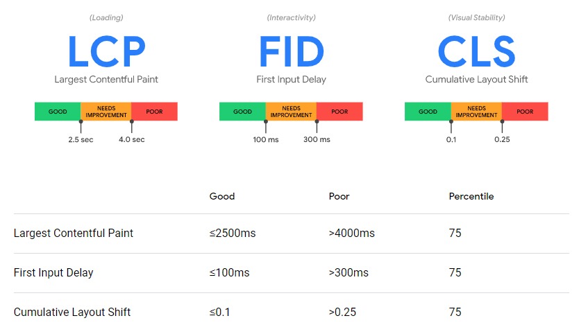 - که این شامل تغییر شیوه های مورد انتظار نیست ، مانند زمانی که کاربر بر روی پیوند یا دکمه ای کلیک می کند که باعث حرکت عناصر صفحه می شود. در زیر سه سطل گوگل برای رتبه بندی این امتیازها در Core Web Vitals ارائه شده است. باز هم ، آنها به شما توصیه می کنند حداقل ۷۵٪ از صفحات خود را "خوب" بدست آورید: