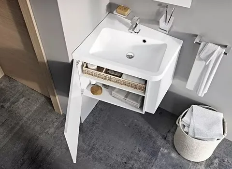 روشویی کابینتی گوشه ای فقط روشویی نصب شده در گوشه نیست و این روشویی، شکل جالبی شبیه ذوزنقه یا مثلث دارد و با توجه به طراحی استاندارد، این محصول کاملا کاربردی است: دارای یک سینک بزرگ و فضای اضافی برای گذاشتن مایع دستشویی است.