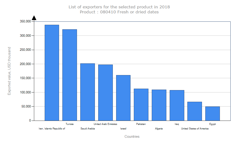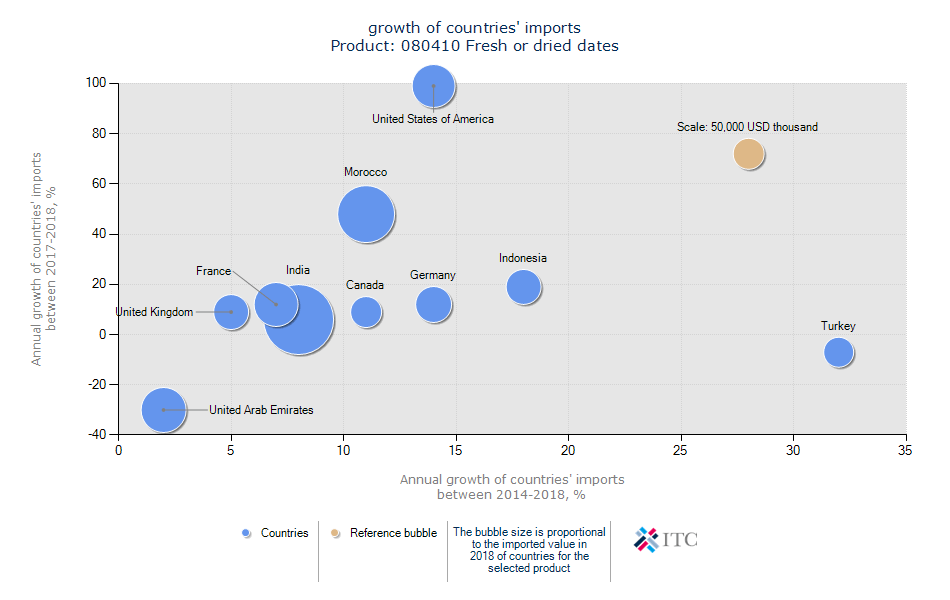 بازار آمریکا بیشترین میزان رشد سالانه و پنج ساله در واردات خرما را داشته است. مراکش، اندونزی، آلمان، کانادا، ترکیه، فرانسه و انگلستان در رتبه های بعدی قرار دارند.