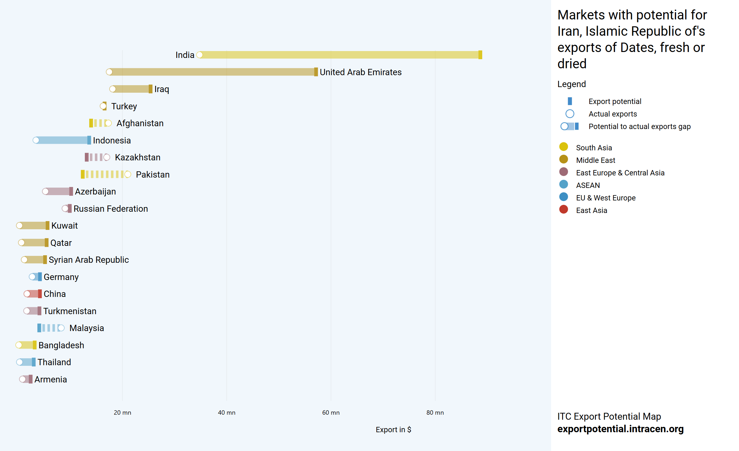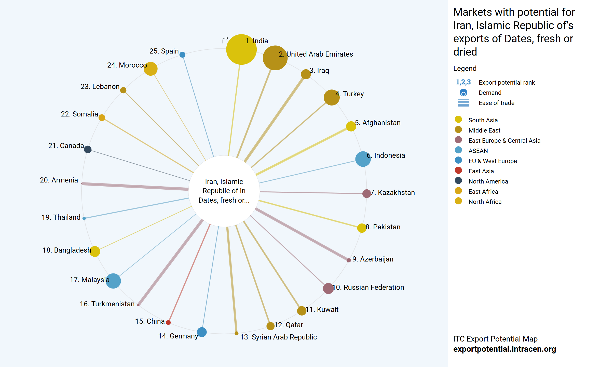 بهترین مقصد های صادرات خرما از ایران با توجه به میزان پتانسیل صادراتی و آسان بودن روابط تجاری دو کشور را کشورهای هند، امارات و عراق دارا هستند.