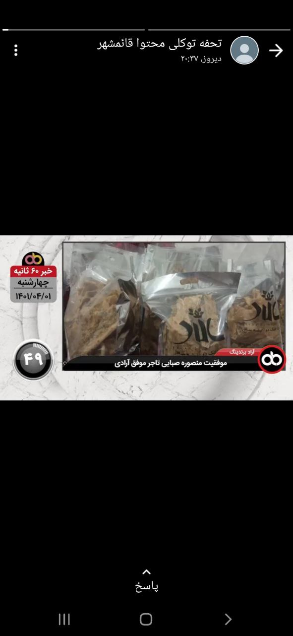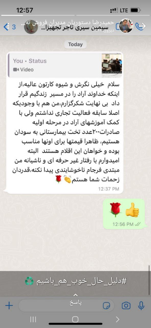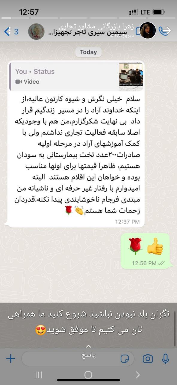 راحله طاهری فرد از کارمندان مشغول در معاونت فنی و سایت، کلیپی از محصولات صادراتی تاجران موفق را در استاتوس خود قرار داد.
