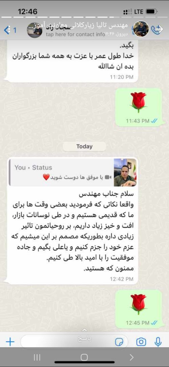 زینب اعتصامی از مشاوران تجاری مجموعه، کلیپی از سخنرانی مهندس زیارکلائی را در استاتوس خود قرار داد.