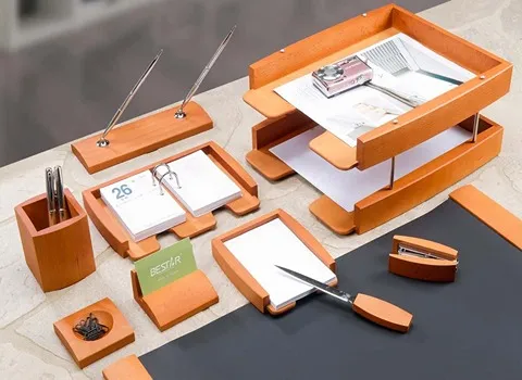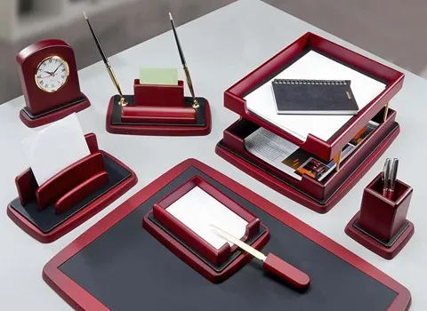 ست لوازم اداری در نوع رومیزی بیشتر از جنس چوب ام دی اف با روکش های رنگی تولید می شوند که در نوع خود بسیار زیبا بوده و طرح های تراش کاری، منبت کاری و ساده را می تواند در تولید مورد پذیرش قرار دهند.