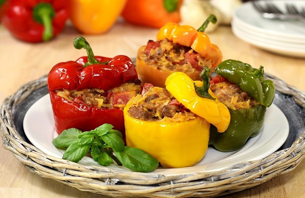 فلفل دلمه ای به نوعی از فلفل های شیرین گفته می شود که شکل گردی دارد و مانند دیگر فلفل ها تند نیست. این فلفل در زنگ های زرد، سبز، قرمز و نارنجی وجود دارد. در این مطلب در رابطه با فلفل دلمه ای شکم پر رژیمی با گوشت چرخ کرده در فر صحبت می نماییم. فلفل دلمه ای که سالانه در مقادیر بالایی در چین، مکزیک، اندونزی و آمریکا تولید می شود سرشار از آنتی اکسیدان، ویتامین سی و کاروتن است. در سال های اخیر کیفیت تولیدات ایرانی در فلفل دلمه ای به طور چشمگیری بالا رفته و در حال صادرات این محصول به سراسر دنیا هستیم. نوع صادراتی این محصول بیشتر در شرایط گلخانه ای تولید می شود و این روز ها در بیشتر بازارهای میوه و تره بار فلفل دلمه ای رنگی پیدا خواهید کرد. با این فلفل های خوشرنگ غذاهای مجلسی و خوشمزه ای می توان درست کرد که در این مطلب به چند مورد از این غذا ها اشاره خواهیم نمود. از فلفل دلمه ای در بیشتر غذاها می توان استفاده کرد و حتی در ترکیب با سالاد هم طعم ویژه ای به آن می بخشد. در نتیجه از اضافه کردن این منبع غنی از ویتامین سی به برنامه ی غذایی خود غافل نشوید.
