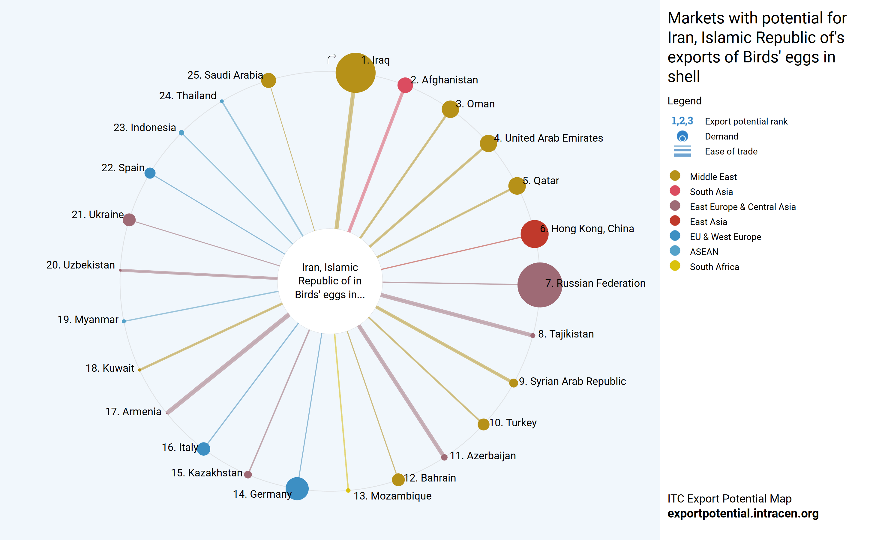در این نمودار میزان توان و ظرفیت صادرات به کشورهای دیگر را به ترتیب عددی، که نشان دهندهی رتبه پتانسیل صادراتی و به ترتیب اندازه دایره، که نشان دهندهی میزان تقاضای کشورها و به ترتیب پهنای خط، که نشان دهندهی سهولت معامله با آنهاست، میتوان مشاهده کرد.