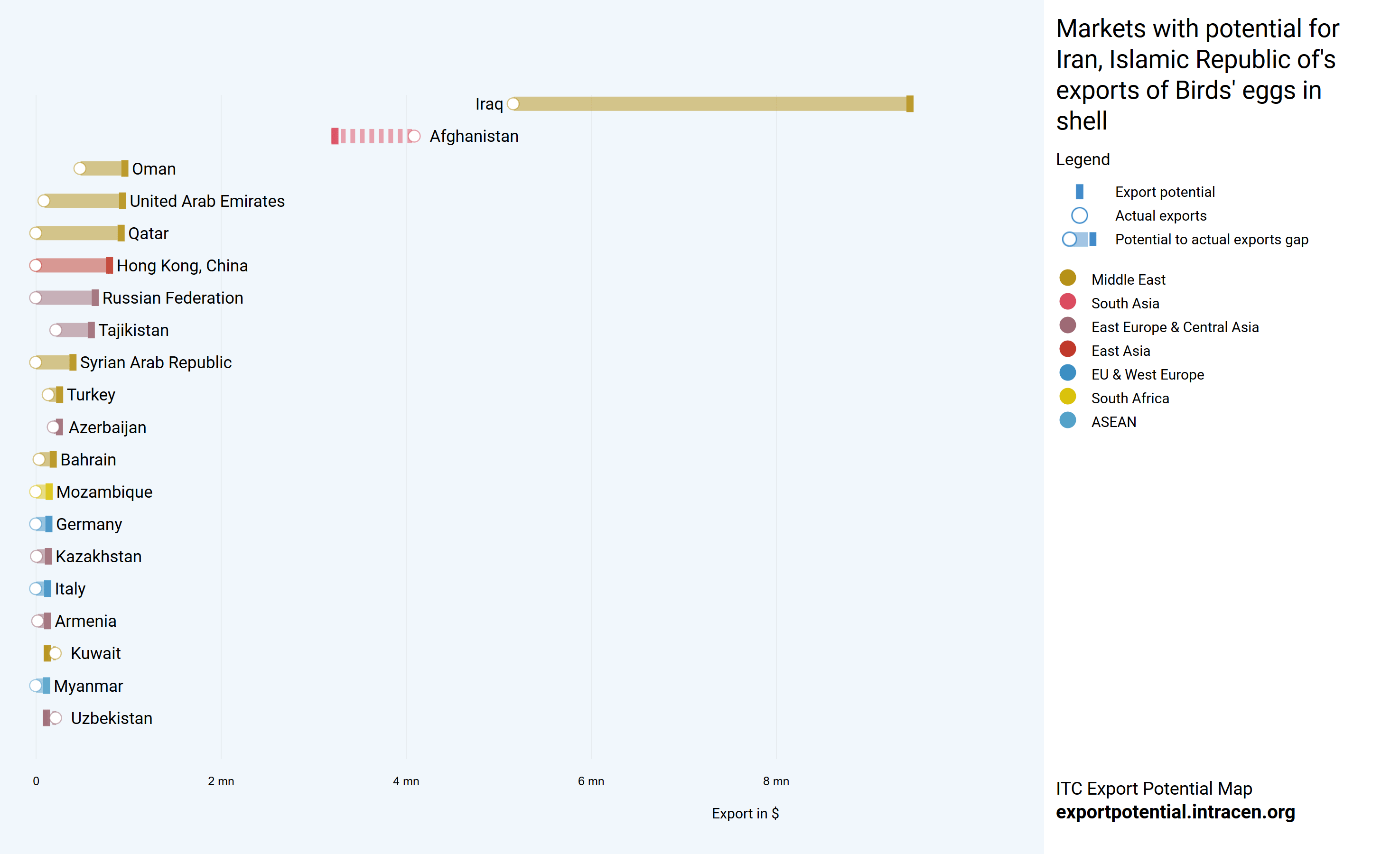 عراق بیشترین تفاوت بین پتانسیل صادرات و صادرات واقعی را از نظر ارزش نشان میدهد، ظرفیت باقیمانده صادرات به ارزش ۴٫۲ میلیون دلار است.