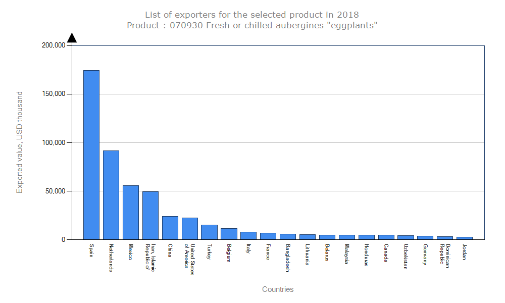 بزرگترین صادرکننده بادمجان در دنیا اسپانیا با در دست داشتن ۳۳ درصد از سهم بازار جهانی است. در رتبه های بعدی هلند با ۱۷ درصد، مکزیک ۱۱ درصد، ایران ۹ درصد و چین با ۵ درصد سهم صادرات بادمجان در دنیا قرار دارند. در مقابل کشور آلمان با ۱۵ درصد از سهم واردات این محصول بیشترین واردات را دارد. آمریکا و فرانسه در رتبه های بعدی قرار دارند.
