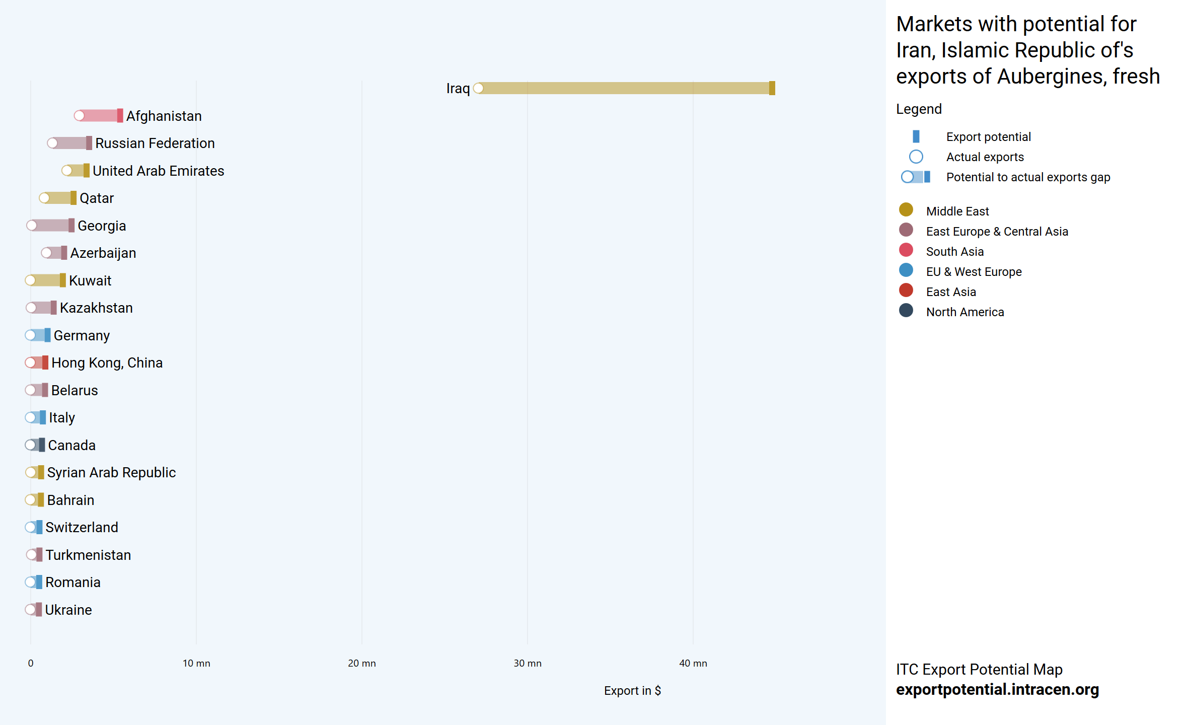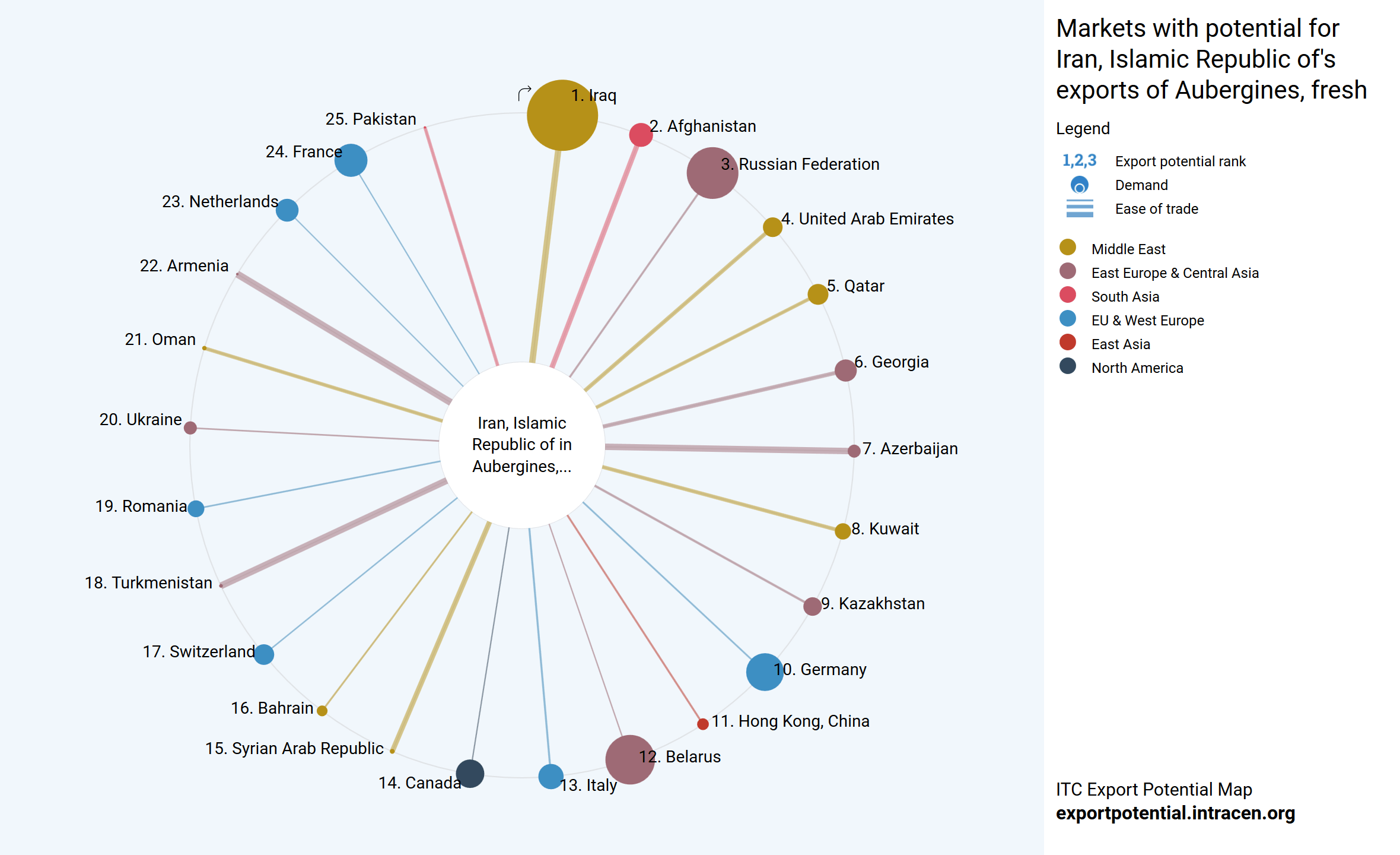 بیشترین ظرفیت و پتانسیل صادراتی برای صادرات بادمجان با توجه به ظرفیت بازار و روابط تجاری آسان را کشورهای عراق، افغانستان و روسیه دارا هستند. ایران نزدیکترین ارتباط صادراتی را با ارمنستان دارد. بازار عراق بیشترین ظرفیت تقاضا را برای کالای ذکر شده دارد. عراق بیشترین تفاوت بین پتانسیل صادرات و صادرات واقعی را از نظر ارزش نشان می دهد، ظرفیت باقیمانده صادرات به ارزش ۱۷٫۳ میلیون دلار است.