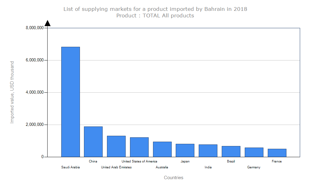 کشور بحرین در سال گذشته ۲۰,۵۹۱,۵۸۷ هزار دلار واردات انجام داده است که کشور عربستان با سهم ۳۳ درصدی و ۶,۸۱۳,۵۲۱ هزار دلار بیشترین میزان صادرات به بحرین را داشته است. چین با ۱,۸۷۶,۷۹۶ هزار دلار و ۹ درصد و امارات با ۱,۳۰۸,۳۱۹ هزار دلار و ۶ درصد در رتبه های بعدی قرار دارند.