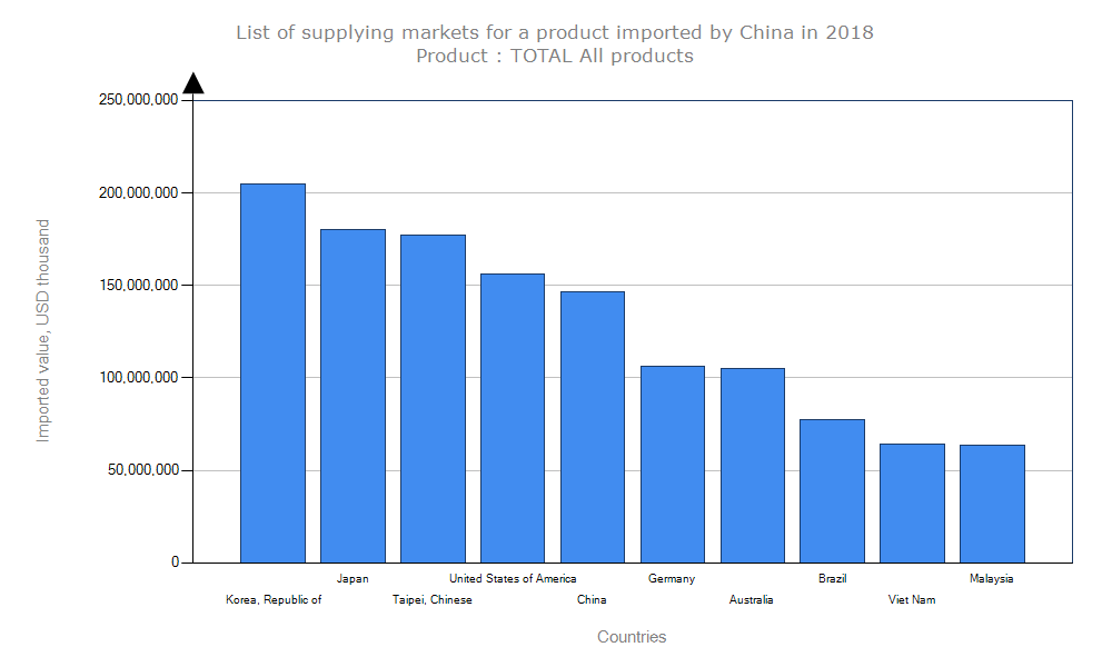 کشور چین در سال گذشته ۲,۱۳۴,۹۸۷,۲۶۵ هزار دلار واردات انجام داده است که کشور کره جنوبی با سهم ۱۰ درصدی و ۲۰۴,۵۶۶,۴۵۱ هزار دلار بیشترین میزان صادرات به چین را داشته است. ژاپن با ۱۸۰,۴۰۱,۷۸۶ هزار دلار و ۸ درصد و چین تایپه با ۱۷۷,۳۴۵,۳۶۲ هزار دلار و ۸ درصد در رتبه های بعدی قرار دارند.