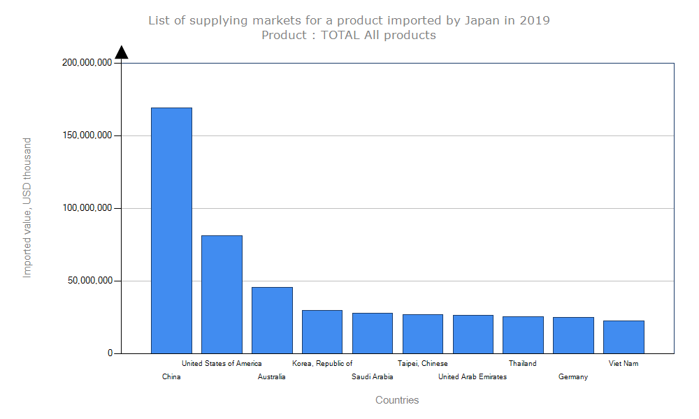 کشور ژاپن در سال گذشته ۷۲۰,۹۶۴,۴۴۵ هزار دلار واردات انجام داده است که کشور چین با سهم ۲۳ درصدی و ۱۶۹,۲۳۶,۴۶۸ هزار دلار بیشترین میزان صادرات به ژاپن را داشته است. آمریکا با ۸۱,۲۵۹,۴۱۴ هزار دلار و ۱۱ درصد و استرالیا با ۴۵,۴۶۱,۹۷۵ هزار دلار و ۶ درصد در رتبه های بعدی قرار دارند.