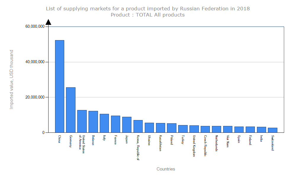 کشور روسیه در سال گذشته ۲۳۸,۱۵۱,۳۷۵ هزار دلار واردات انجام داده است که کشور چین با سهم ۲۲ درصدی و ۵۲,۲۱۷,۹۹۳ هزار دلار بیشترین میزان صادرات به روسیه را داشته است.