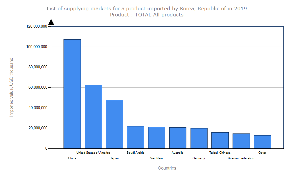 کشور کره جنوبی در سال گذشته ۵۰۳,۲۵۹,۳۹۷ هزار دلار واردات انجام داده است که کشور چین با سهم ۲۱ درصدی و ۱۰۷,۲۱۹,۷۶۳ هزار دلار بیشترین میزان صادرات به کره جنوبی را داشته است. آمریکا با ۶۲,۱۰۲,۸۸۳ هزار دلار و ۱۲ درصد و ژاپن با ۴۷,۵۷۵,۴۳۳ هزار دلار و ۹ درصد در رتبه های بعدی قرار دارند.