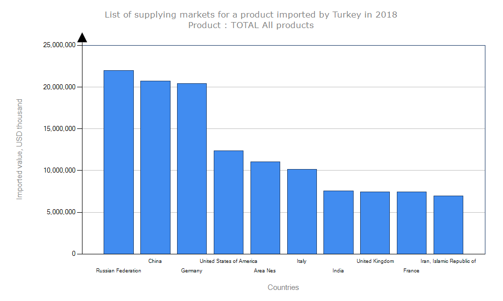 کشور ترکیه در سال گذشته ۲۲۳,۰۴۶,۸۷۹ هزار دلار واردات انجام داده است که کشور روسیه با سهم ۱۰ درصدی و ۲۱,۹۸۹,۵۷۴ هزار دلار بیشترین میزان صادرات به ترکیه را داشته است اما همانطور که در بالا گفته شد به دلیل مشکلات سیاسی و تنش های بین این دو کشور در سال گذشته مبادلات تجاری بین این دو کشور قطع شده است.
