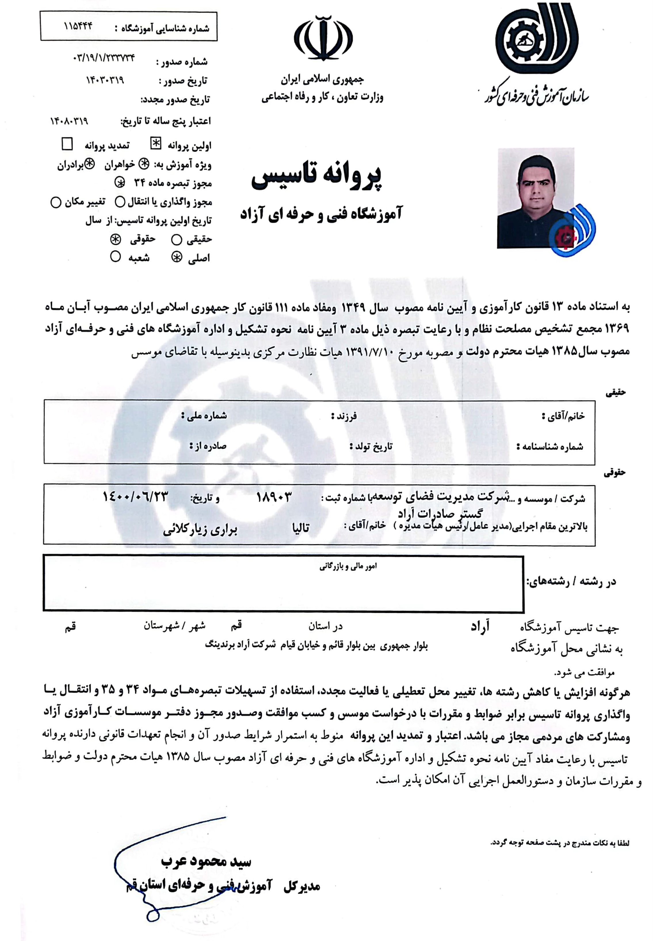 مجوز فنی و حرفه ای آراد برندینگ نیز صادر گردید.