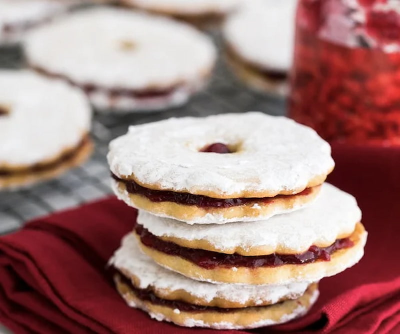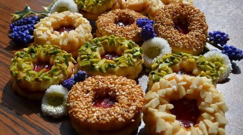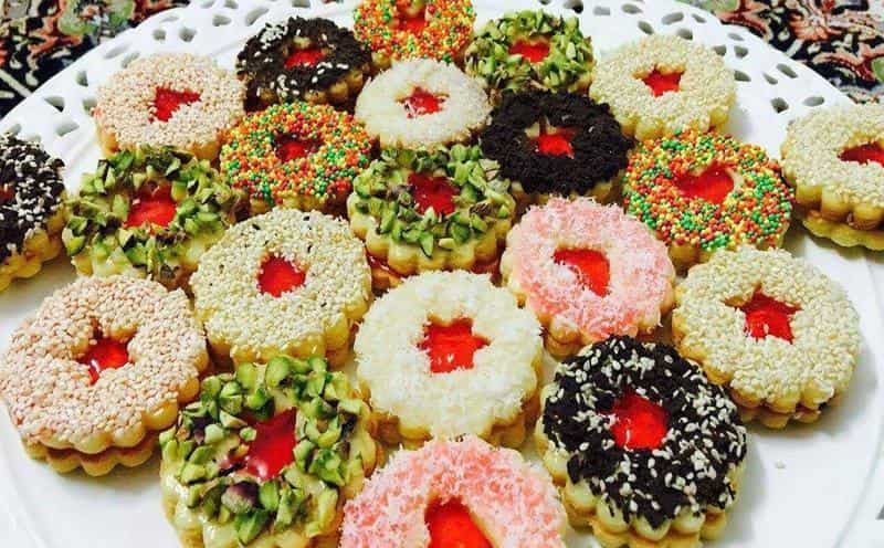 از فر خارج کرده اجازه میدهیم تا بهطور کامل خنک شود. بعد از خنک شدن روی شیرینیها مارمالاد قرار داده شیرینیهای که وسط آنها خالی بود را روی شیرینیهای که مارمالاد زده ایم قرار میدهد و سپس روی شیرینیها را به شربت غلیظ شده آغشته کنید و رد مغزیجات بغلتانید و در پایان برای دیزاین شیرینی از شکلات آب شده استفاده میکنیم.