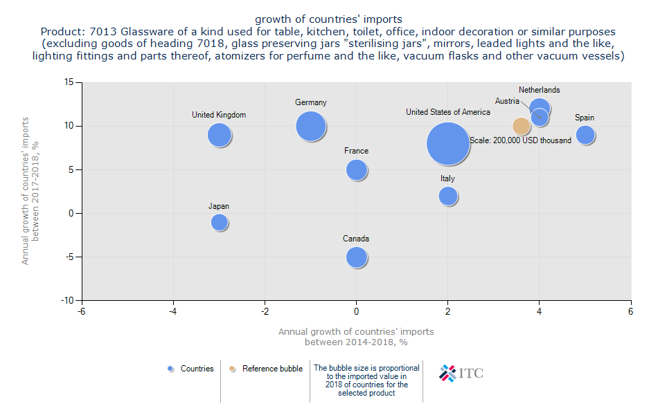 با توجه به نمودار زیر کشور هلند بهترین بازار رو به رشد به عنوان مقصد صادراتی ظروف شیشه ای را دارا است. کشورهای استرالیا، اسپانیا، آمریکا و ایتالیا نیز در رتبه های بعدی قرار دارند.