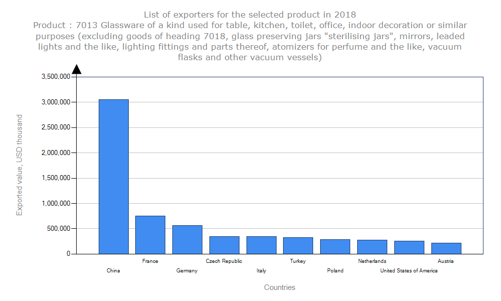 عمده صادرات ظروف شیشه ای بازار جهانی در دست چین است و بعد از آن کشورهای فرانسه، آلمان، چک و ایتالیا قرار دارند. سهم چین در بازار جهانی ۳۵ درصد و ۱۳۸,۹۲۵ هزار دلار است. فرانسه با ۹ درصد و آلمان با ۷ درصد در رتبه های بعدی قرار دارند. ایران نیز با ۱۳۸,۹۲۵ هزار دلار، ۲ درصد از سهم صادرات این ظروف را به خود اختصاص داده است. آمریکا، آلمان و انگلیس بیشترین میزان واردات این محصول را دارند.