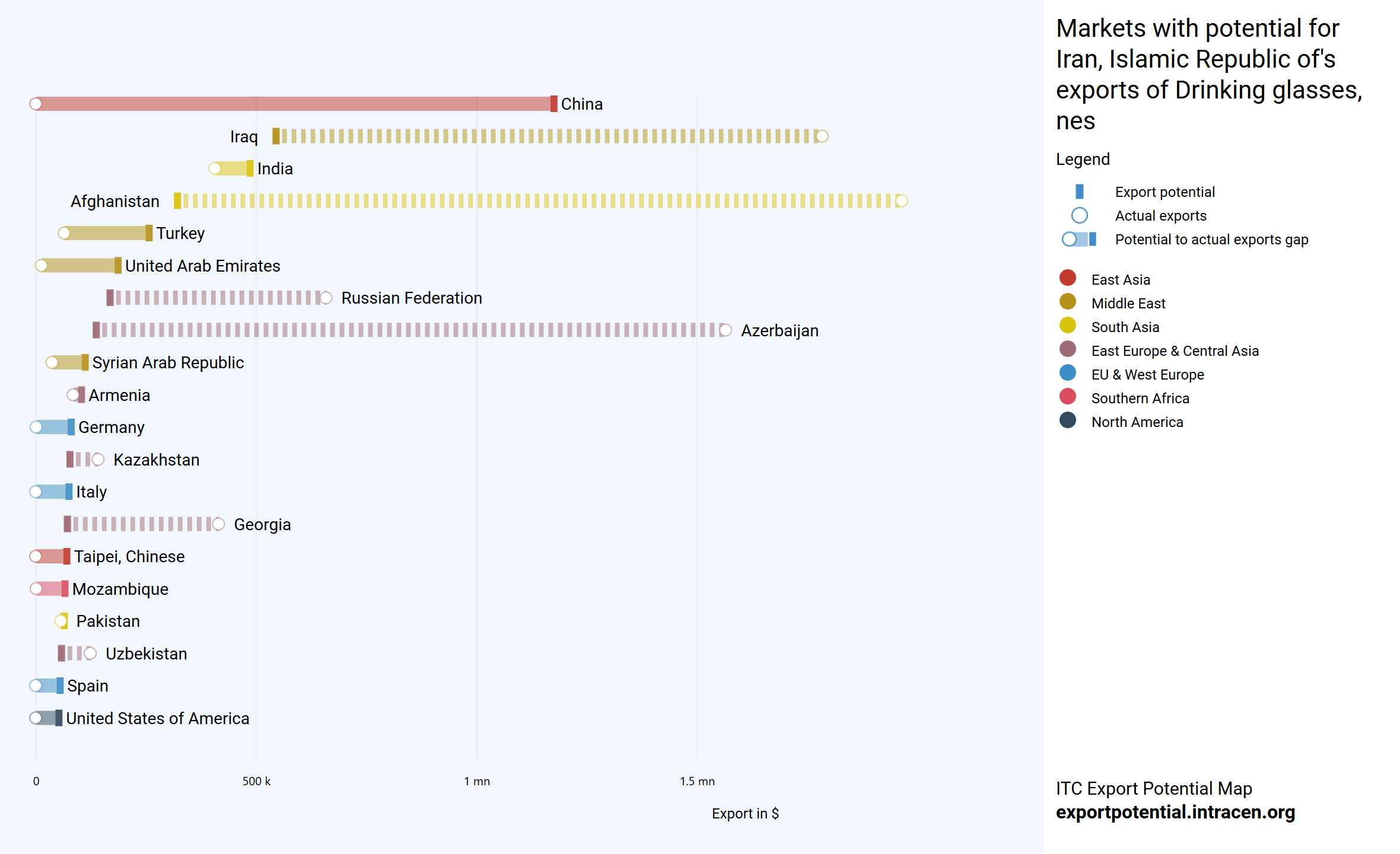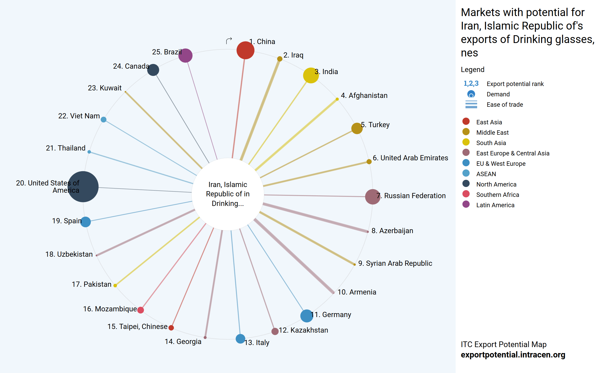 کشورهای عراق، افغانستان، روسیه، آذربایجان، قزاقستان، گرجستان و ازبکستان کشورهای اشباع شده برای صادرات ظروف شیشه ای هستند و بیشتر از ظرفیتشان به آن ها این محصول صادر شده است. در مقابل کشورهای چین، هند، ترکیه، امارات، سوریه، ارمنستان، آلمان و ایتالیا دارای پتانسیل صادراتی بالا هستند.