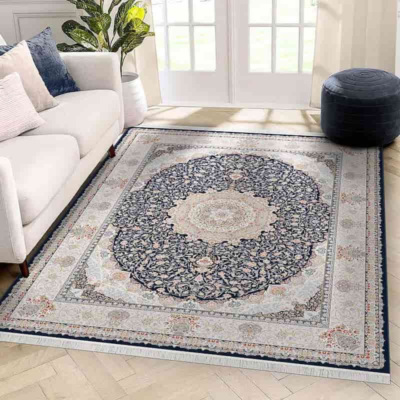 فرش ماشینی خوب کاشان دارای رنگ های نخودی و آبی است
