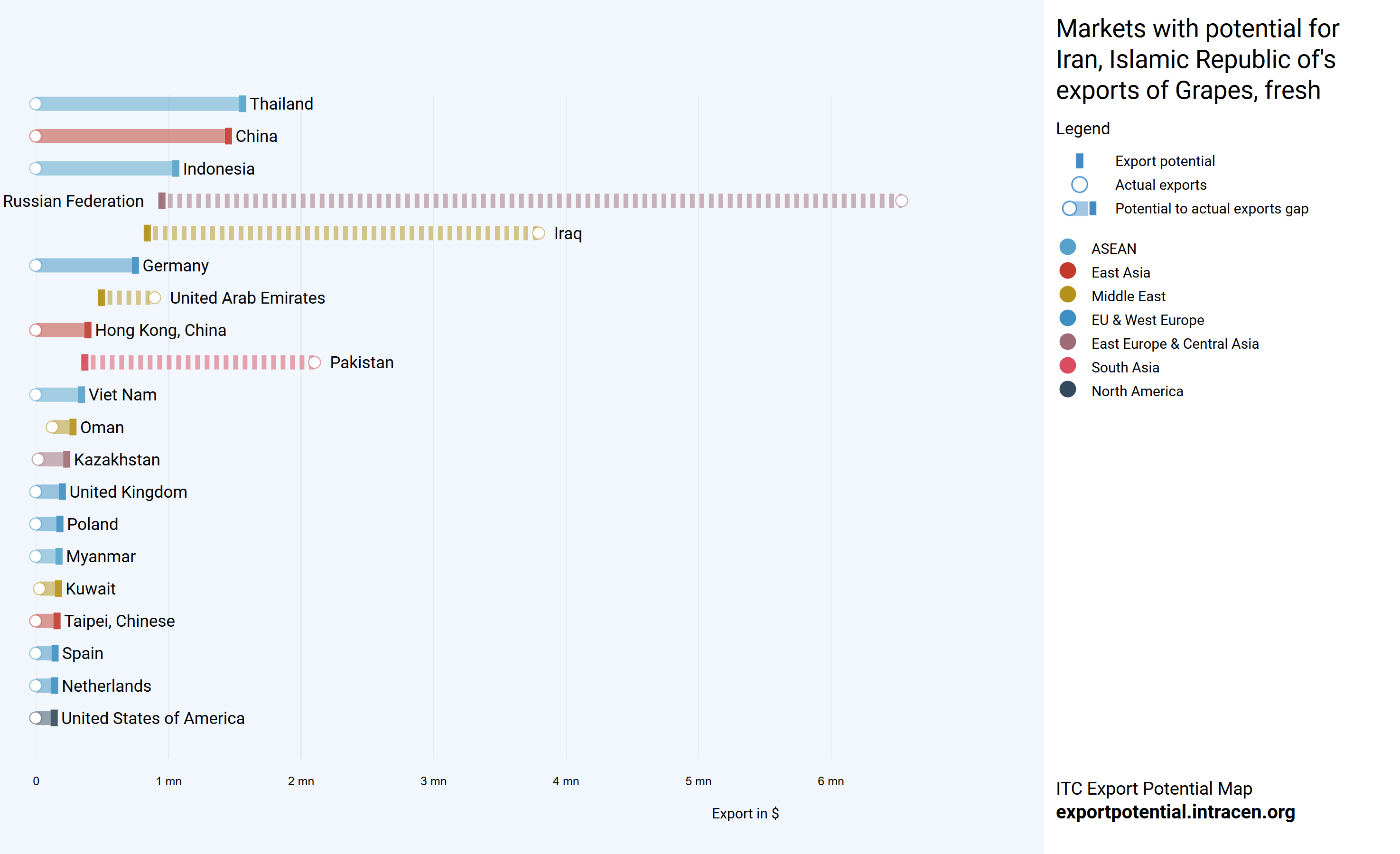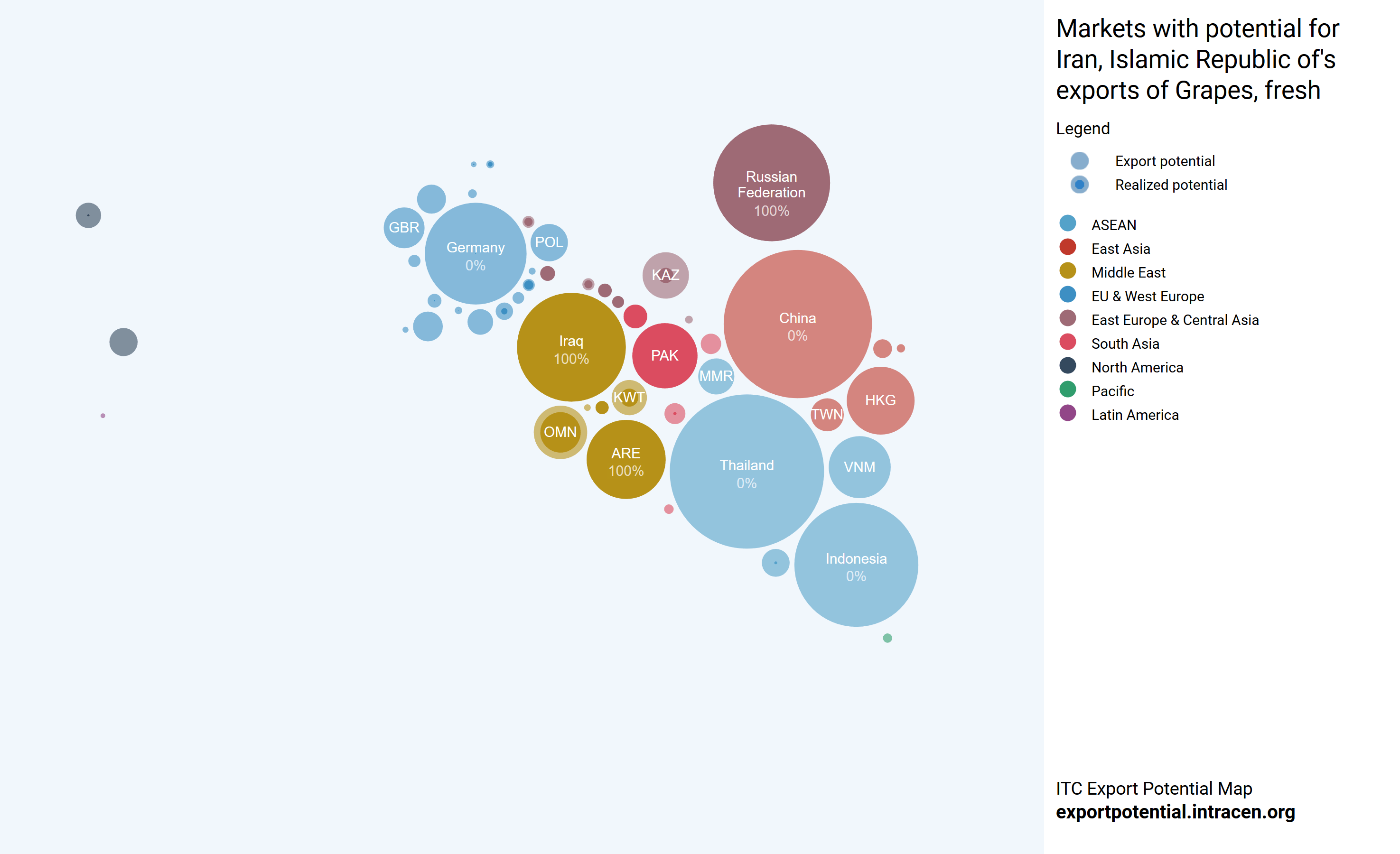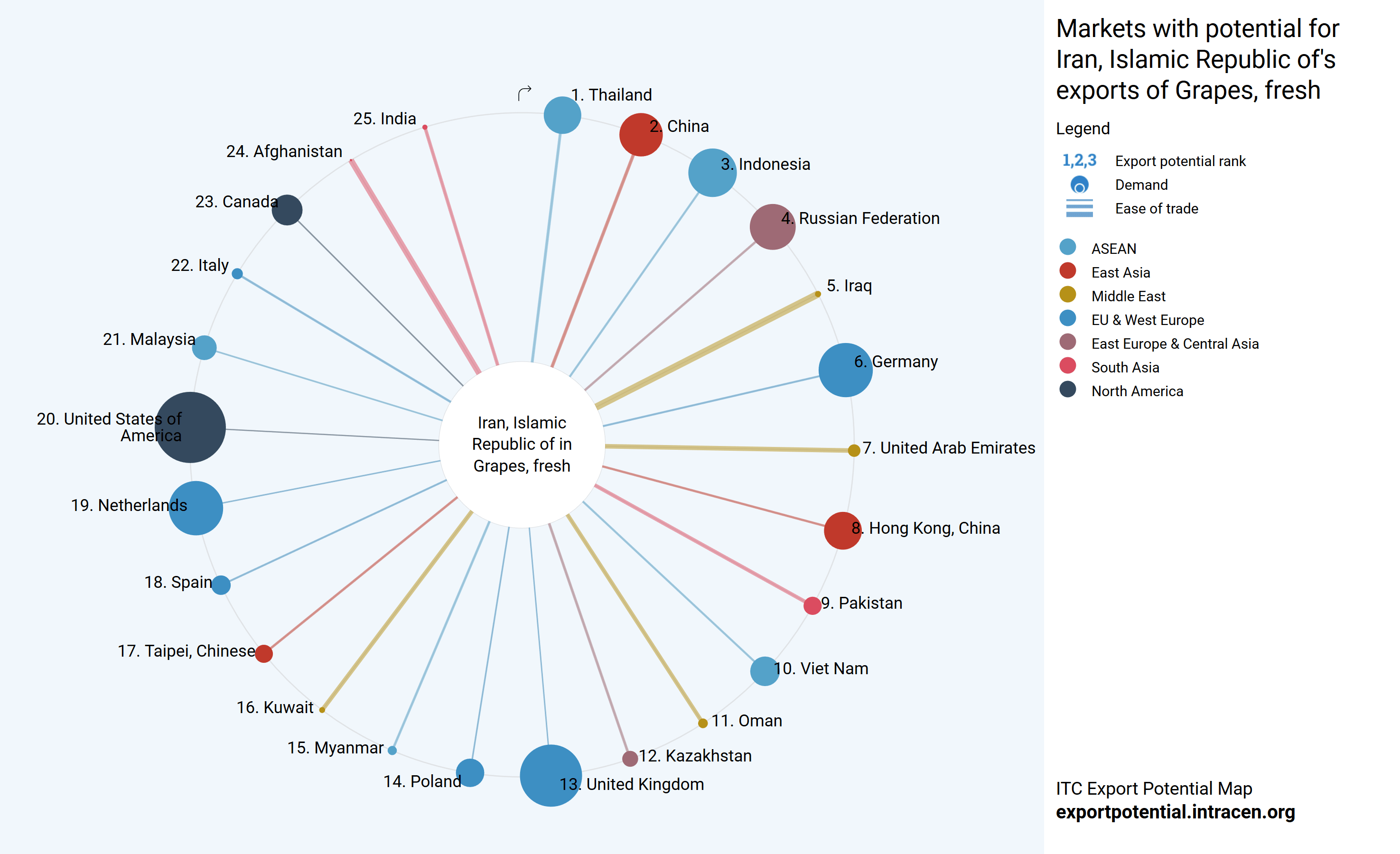 در این نمودار میزان توان و ظرفیت صادرات به کشورهای دیگر را به ترتیب عددی، که نشان دهنده ی رتبه پتانسیل صادراتی و به ترتیب اندازه دایره، که نشان دهنده ی میزان تقاضای کشورها و به ترتیب پهنای خط، که نشان دهنده ی سهولت معامله با آنهاست، میتوان مشاهده کرد. اسم هر کشور کنار دایره نوشته شده و رنگ دایره هر کشور طبق منطقه آن دسته بندی شده است. برای مثال دایره های قرمز کشورهای منطقه شرق آسیا را نشان میدهد.