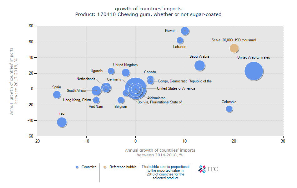 در مقابل آمریکا، امارات و آلمان سه کشور اول در واردات آدامس هستند. بخش قابل توجهی از آدامس وارداتی ایران از امارات وارد می شود.