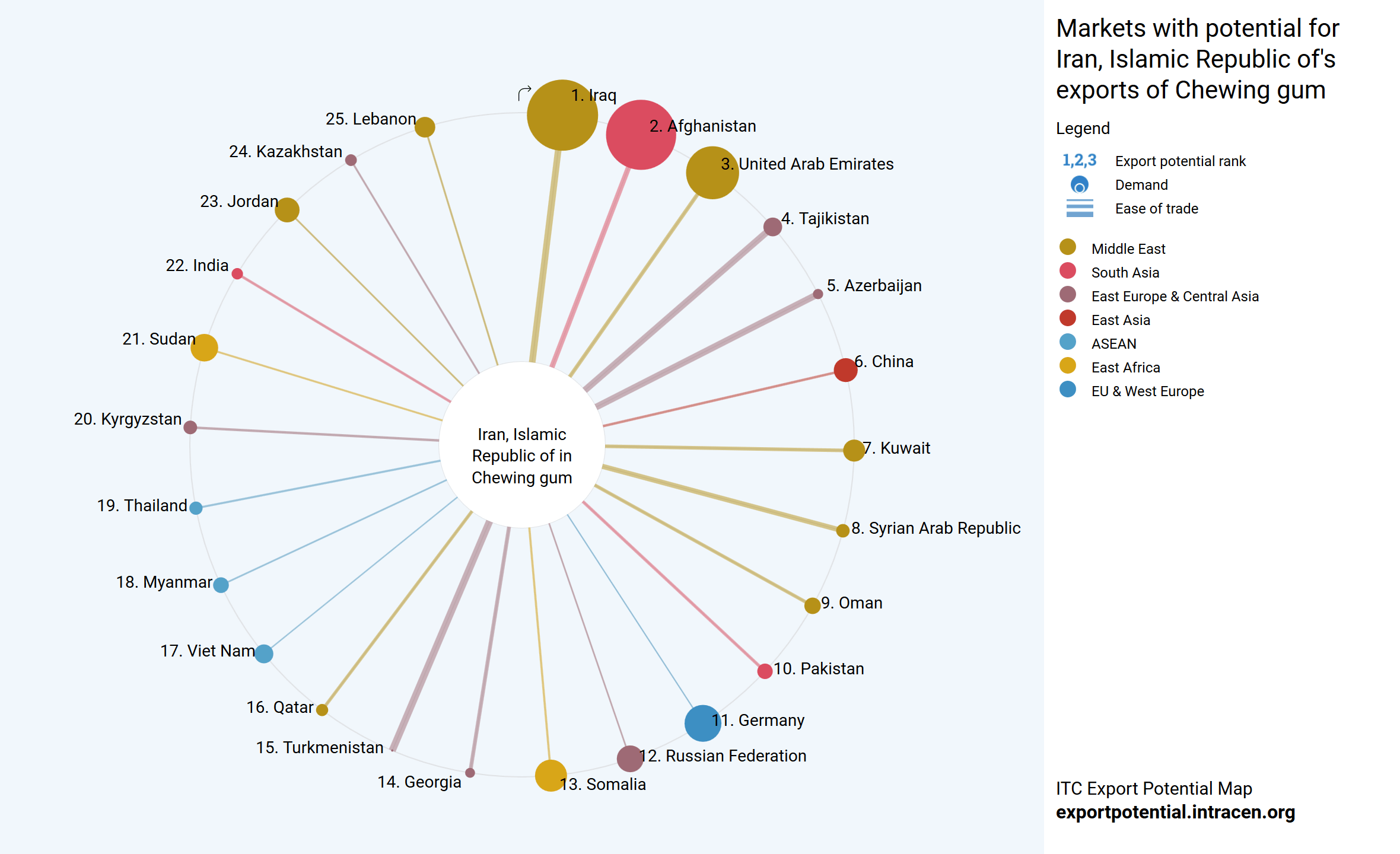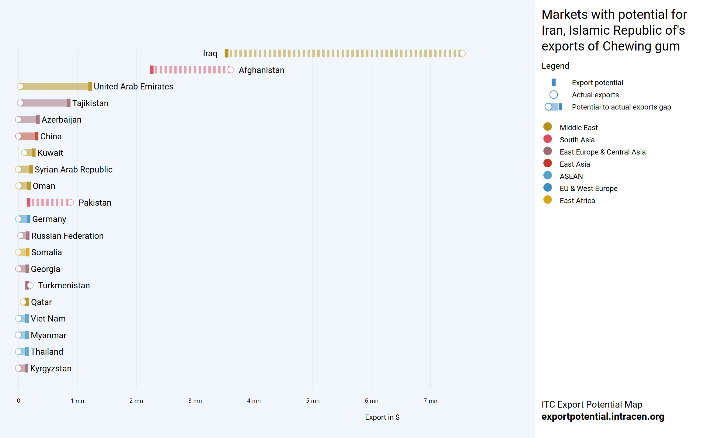 بهترین مقصدهای صادرات آدامس از ایران با توجه به میزان پتانسیل صادراتی و آسان بودن روابط تجاری دو کشور را کشور امارات، عراق و تاجیکستان دارا هستند.