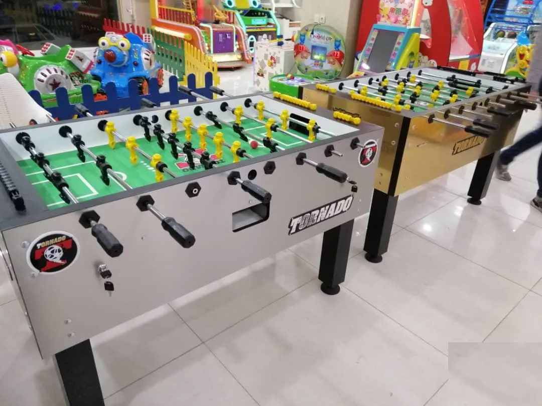 در اتاق بازی برخی هتلها فوتبال دستی تورنادو نصب می شود تا مسافرانی که بچه دارند در زمان استراحت به آنجا رفته و بازی فکری کنند این محصول از فلز طراحی شده است که دارای 8 میله دراز که به مسافت همسان از همدیگر تعبیه شده اند. که در دو طرف 4 عدد از آنها یک دستگیره چوبی دارند تا دو نفر بتوانند با آن بازی کنند که مانند زمین فوتبال 3 آدمک پلاستیکی در دفاع وجود دارند تا از حمله تیم مقابل جلوگیری کنند و همچنین در کف آن مانند زمین چمن به رنگ سبز و خط کشی شده می باشد.