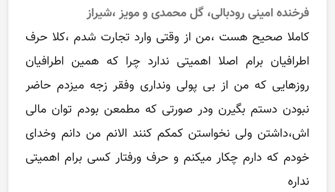 کامنت ها و دلنوشته تاجران آرادی حاوی مطالب مفید از جمله صبر و استقامت در کار ، بی توجهی به حرفهای اطرافیان مخالف شغل تجارت، و استقبال از طرح معرفی افراد جدید به شغل تجارت و آراد برندینگ می باشد