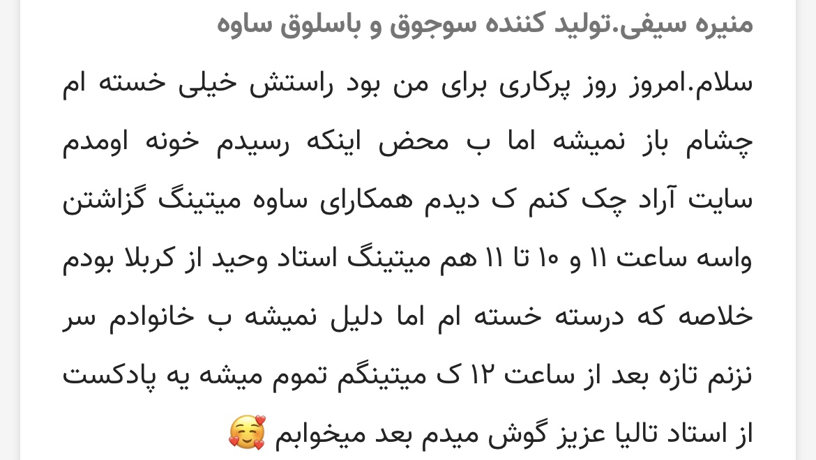 هر کدوم از کامنتهای دوستان را میخونم خودم را به جای اونها میزارم یکی از روزمره گفته با اینکه خسته بود ولی میتینگ استاد وحید را از کربلا دیده، یکی از اینکه نباید به حرف اطرافیان که میخوان ما را از تجارت منصرف کنن گفته خب واقعا یکی بهشون بگه خب خرج من را تو میدی که میگی نرو تجارت یا ی کاری سراغ داری واسم آخه باید ی پیشنهاد بدید فقط حرف میزنید همه بلدن حرف بزنن، یکی از اینکه با ی کامنت جایزه هم برده گفته، واقعا مثل ی خانواده بزرگ شدیم که اتفاقایی که در طول روز افتاده را میایم مثل یک خانواده با کامنت باهم به اشتراک میزاریم