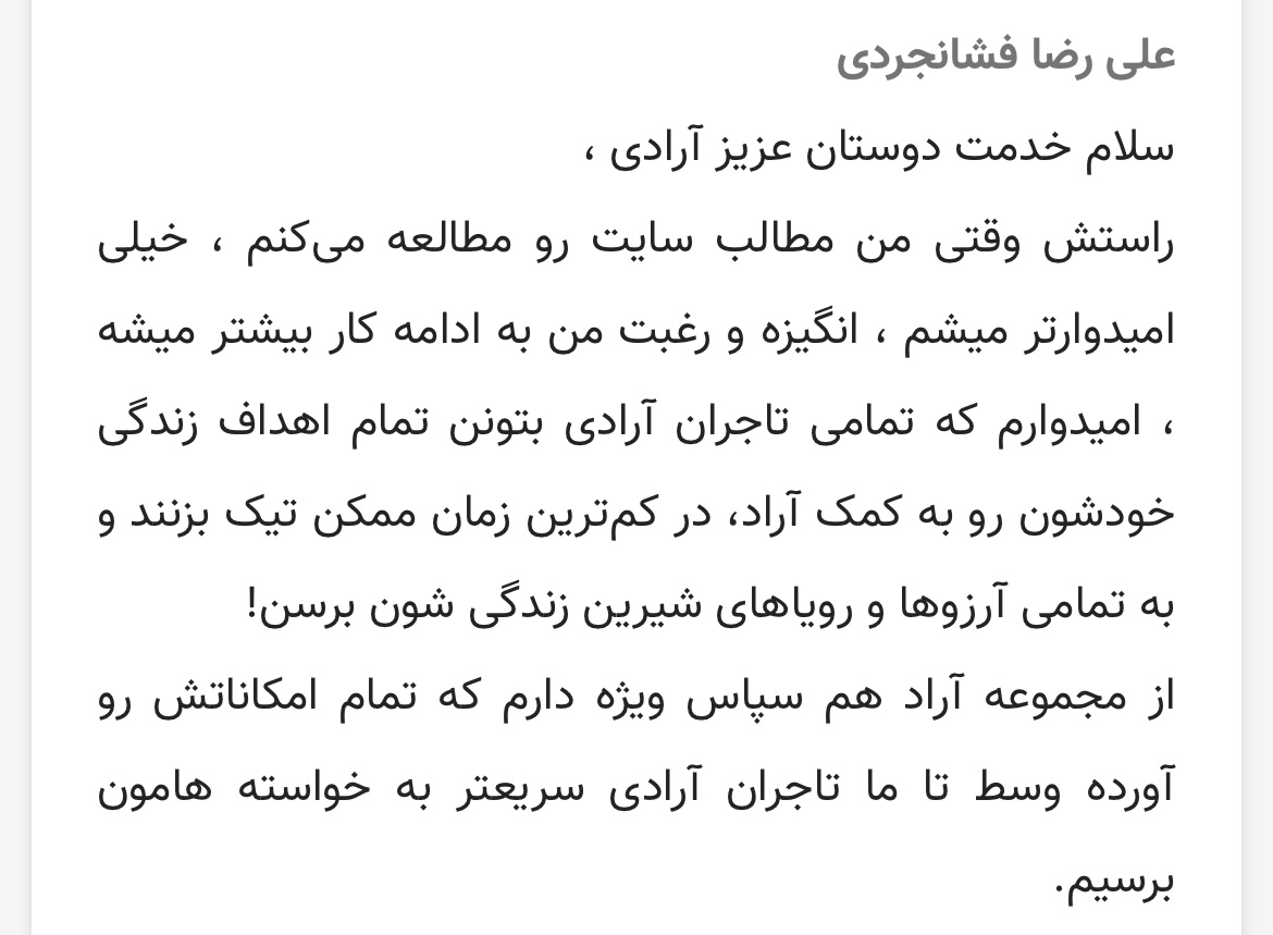 چقدر برام جذاب بود کامنت دوستان عزیز آرادی که هر کدام بیان کردند نوع دیدگاه خودشونو و تاثیری که خدمات آراد در فروش و موفقیتشون داشته
