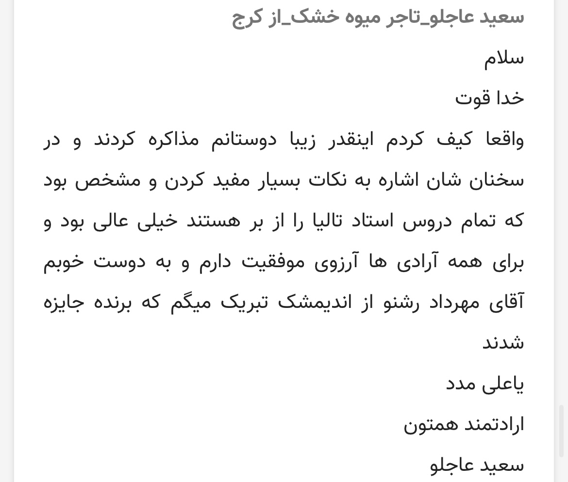 اینکه اسم تاجر های قدیمی رو هم داخل اسامی برندگان میبینم یه حس خوشحالی متفاوتی داره. اینکه میبینم فرد هنوز مشغوله و همچنان عاشقانه راجب آراد مینویسه حسیه که هیچ جوره قابل قیمت گذاری نیست