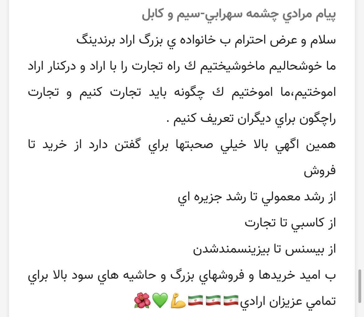 سلام به خانواده ارادیم که منو مثل یک پیله در دل آموزش هایش و دلسوزی استادان بزرگ پرورش داد و مسیر تجارت رو بهم آموزش داد و این لطف بزرگ خدا رو همیشه شاکرم ❤️❤️❤️❤️❤️