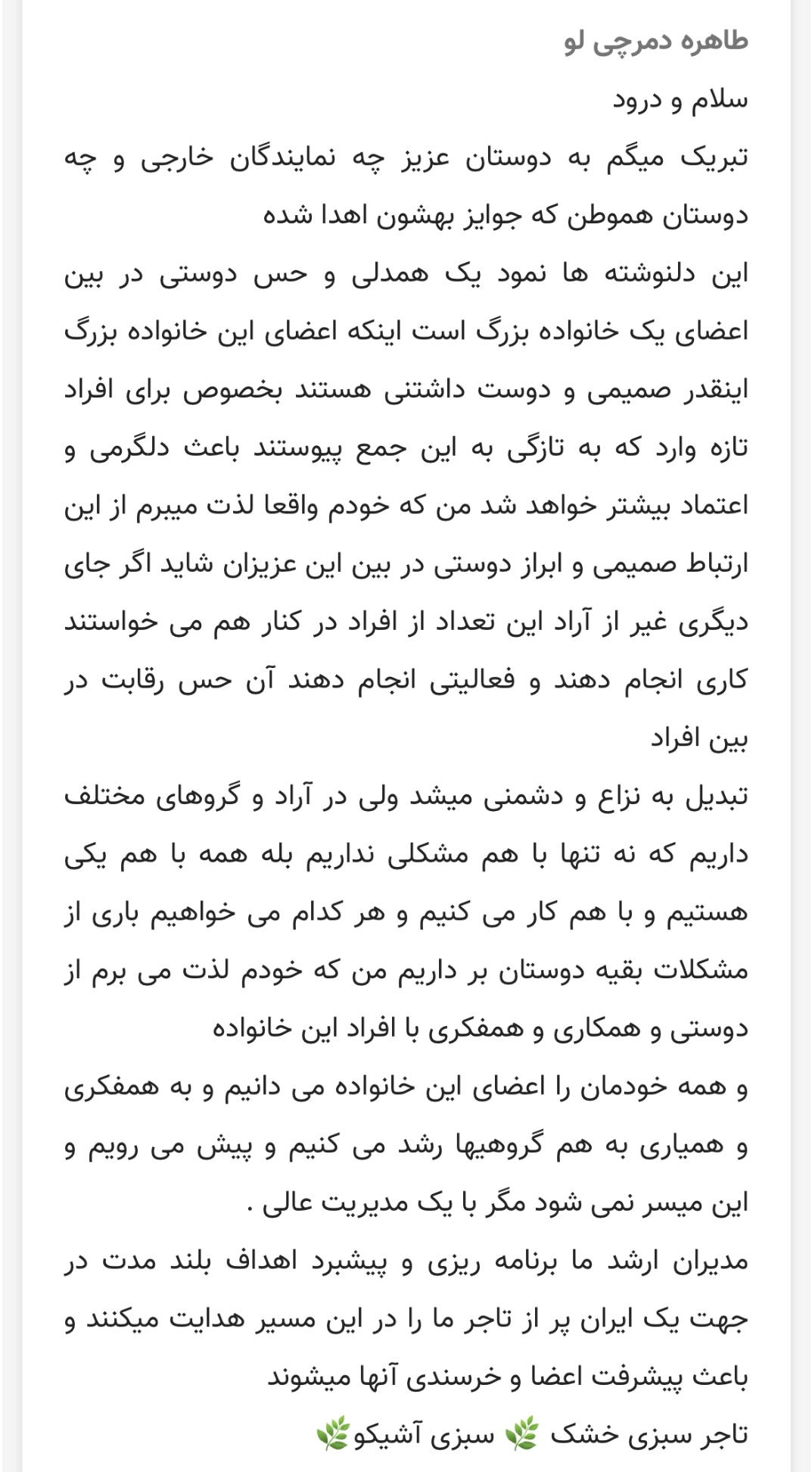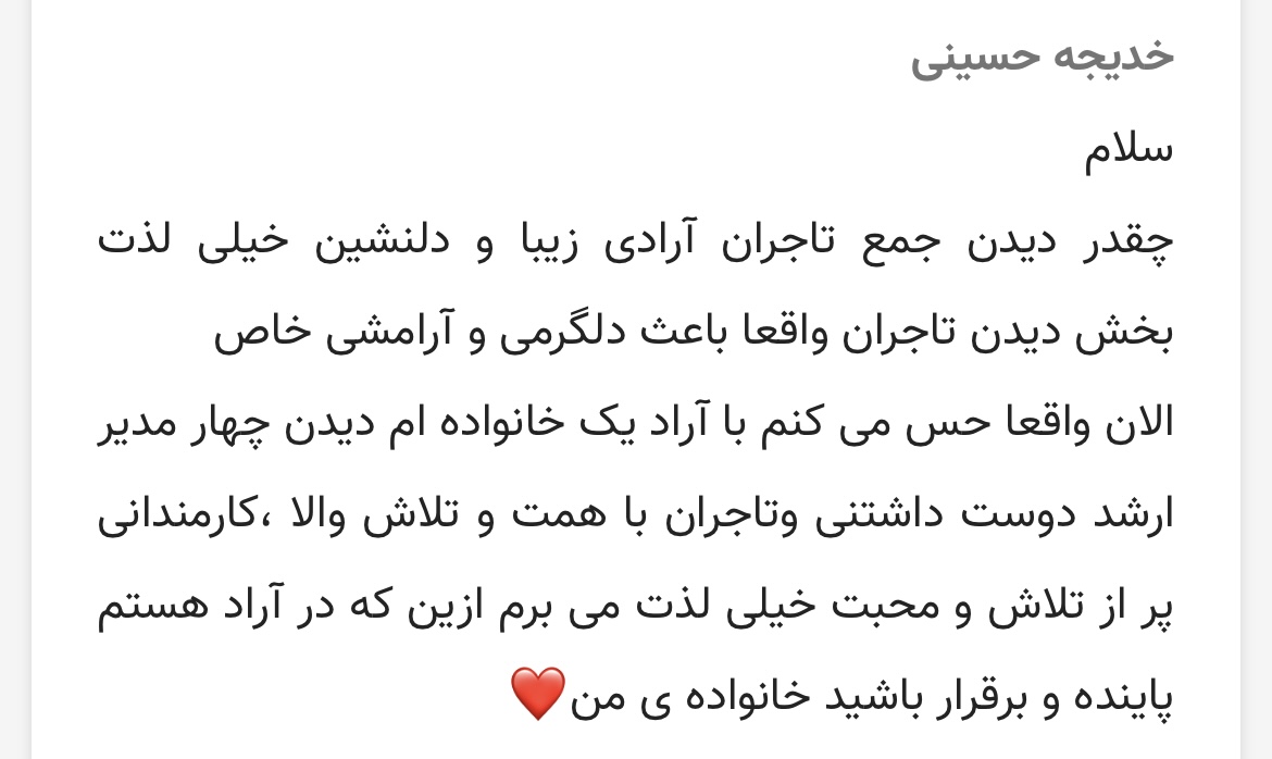 همیشه اخبار خوب، حس و حال خوب از تاجرا و همکارای آرادی، خوشحالم که هستید و حال تون خوبه و ممنونم که حال خوب تون رو با ما به اشتراک میگذارید.