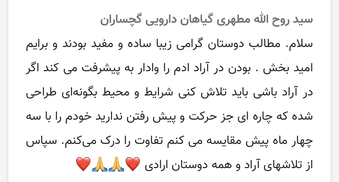 وقتی به صورتهای مهربان و پر نور آرادی ها نگاه میکنم و متنهای پر از مهرتان را میخوانم با خودم میگویم خدایا شکرت که وقتی در جمع افرادی قرار گرفته ام که همواره شکر نعمت ،نعمتشانرا افزایش داده است