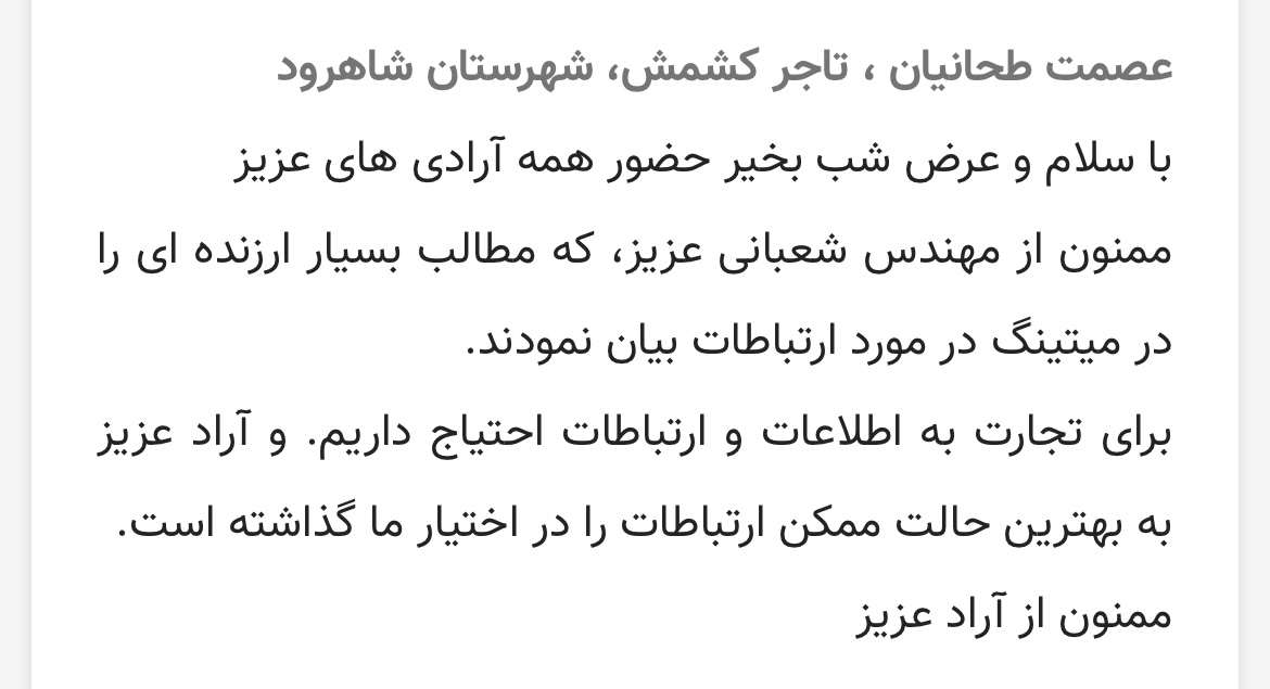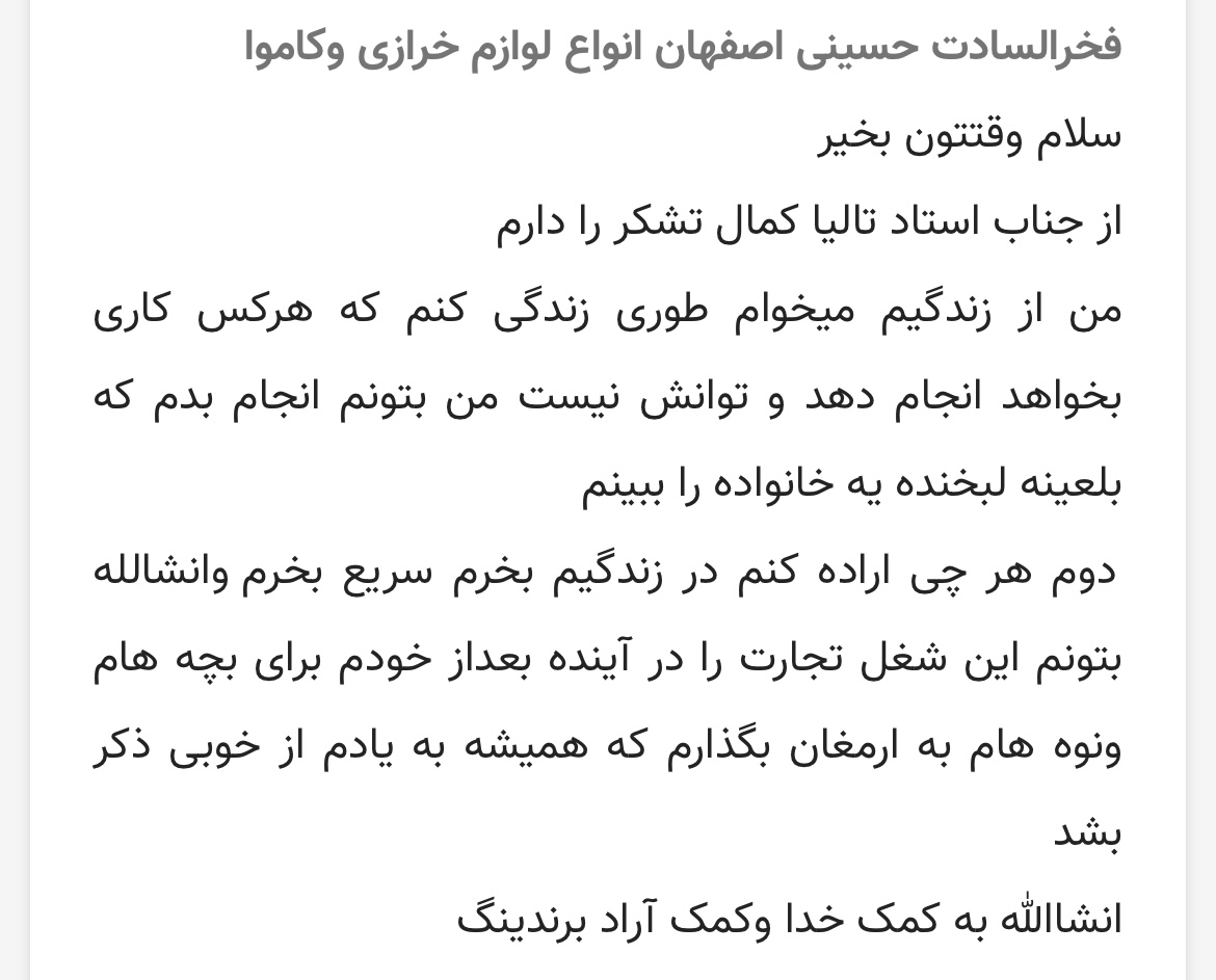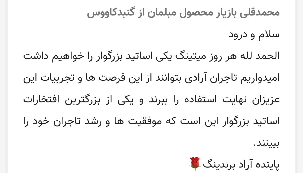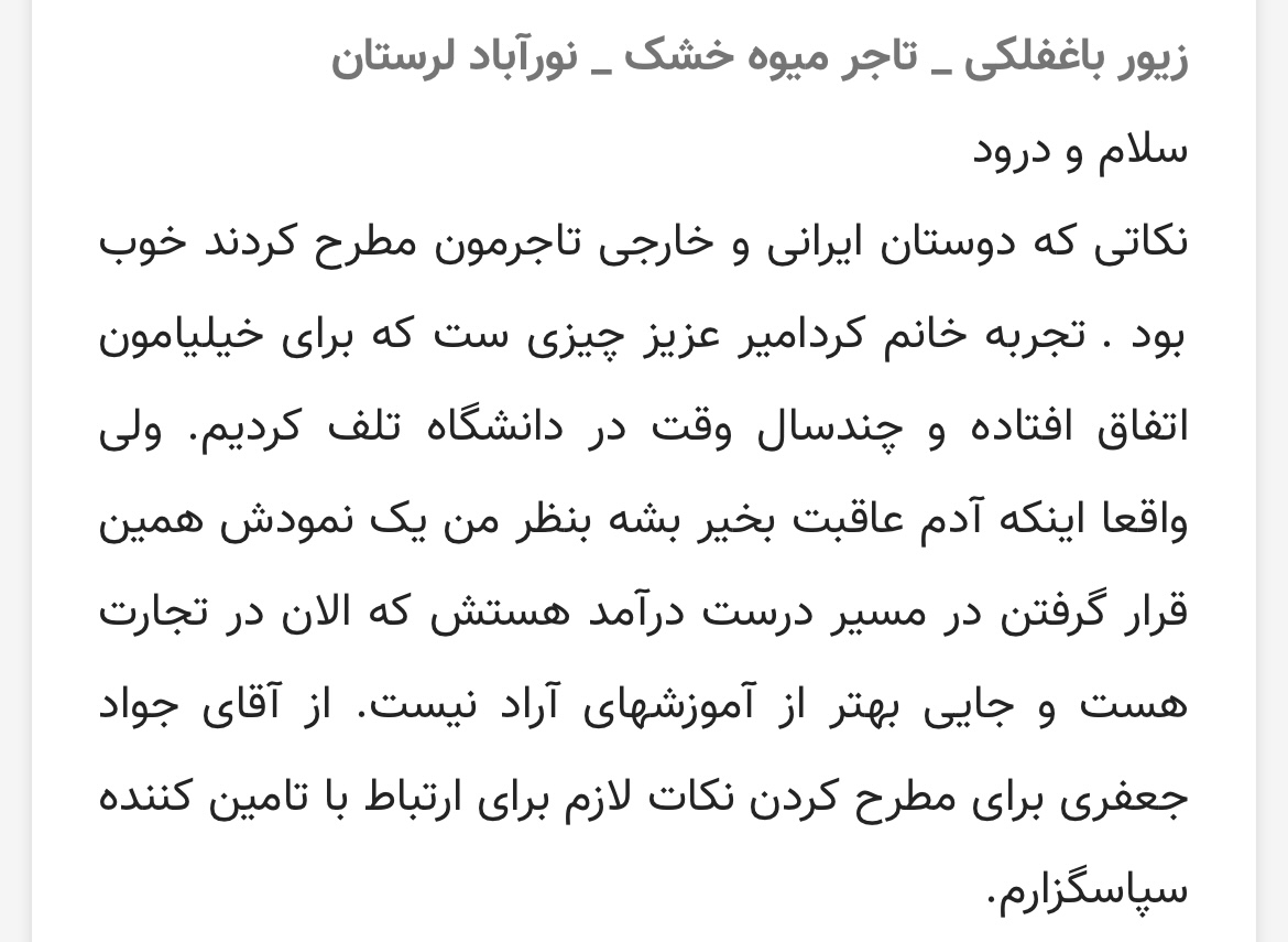 تبریک به تاجران سرزمینمان ایران، خیلی خوشحالم که از جای جای این وطنم با تجارت آشنا شدند و با خیلی از کشورهای خارجی روزانه در ارتباط هستند و همه در خانواده آراد روز به روز رشد می کنیم.