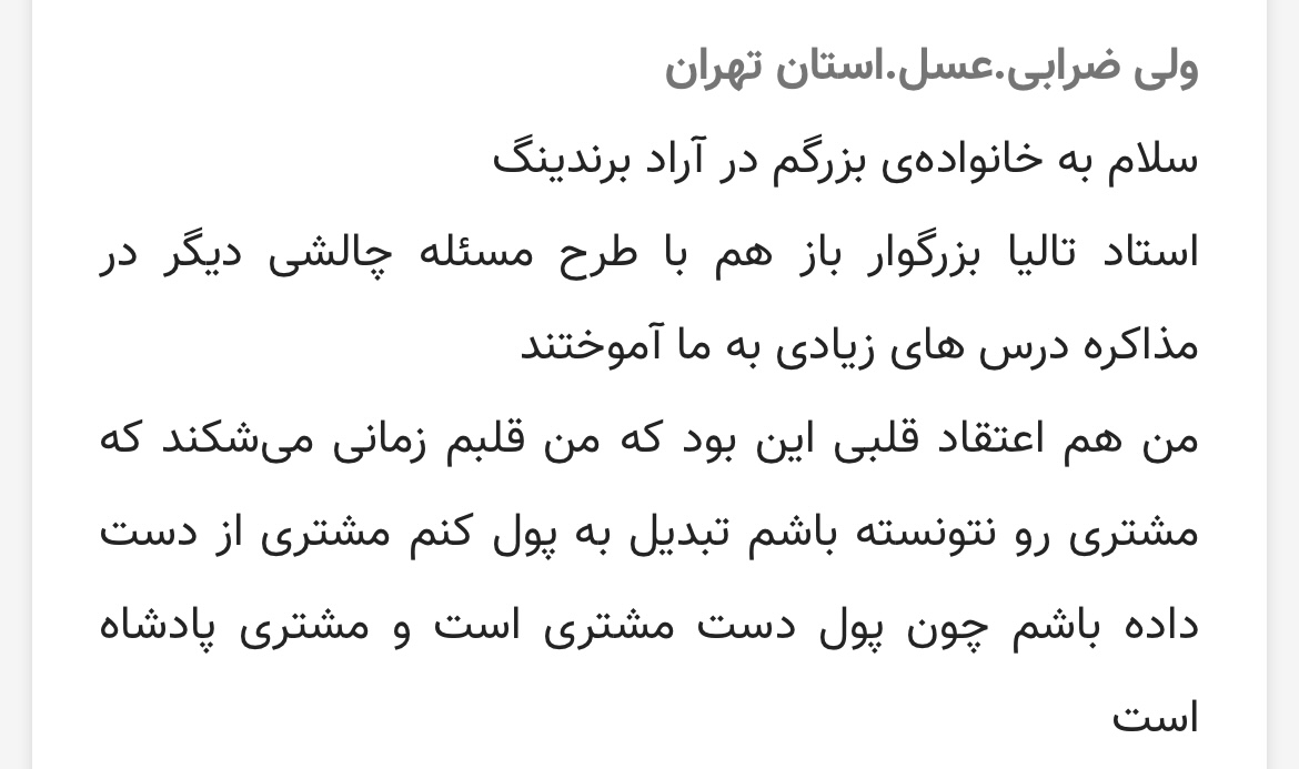 آقای ولی ضرابی خیلی زیبا و عاقلانه نوشتن که: «من قلبم زمانی می شکند که مشتری رو نتونسته باشم تبدیل به پول کنم»