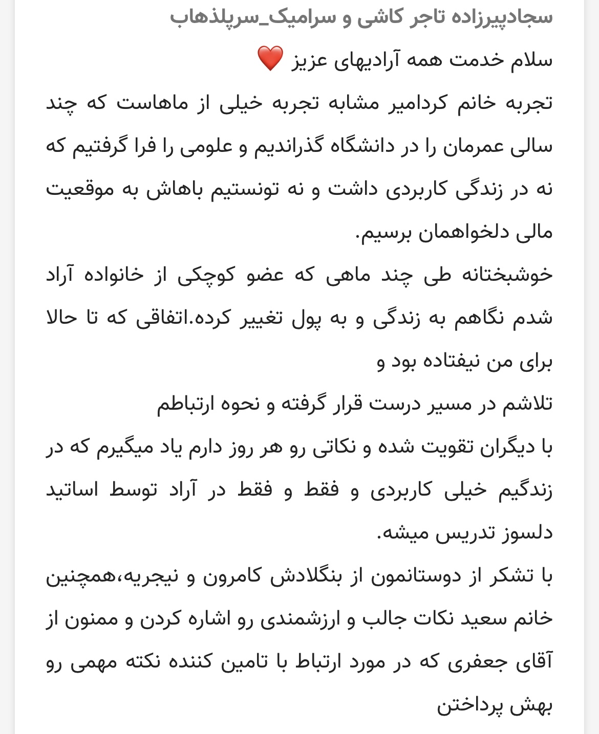 واقعا آراد ستودنیست آراد بخشی از وجود ما هست این جمله ازته قلبم مینویسم من آراد رو دوست دارم وبرای هرکاری که باشه باهاش میجنگم تا خودم رو ثابت کنم که من میتوانم موفق باشم میتونم تاجر موفقی باشم هروز که میگذرد ذره ای علاقه من نسبت به آراد کم نمیشود بلکه افزون تر هم میشود