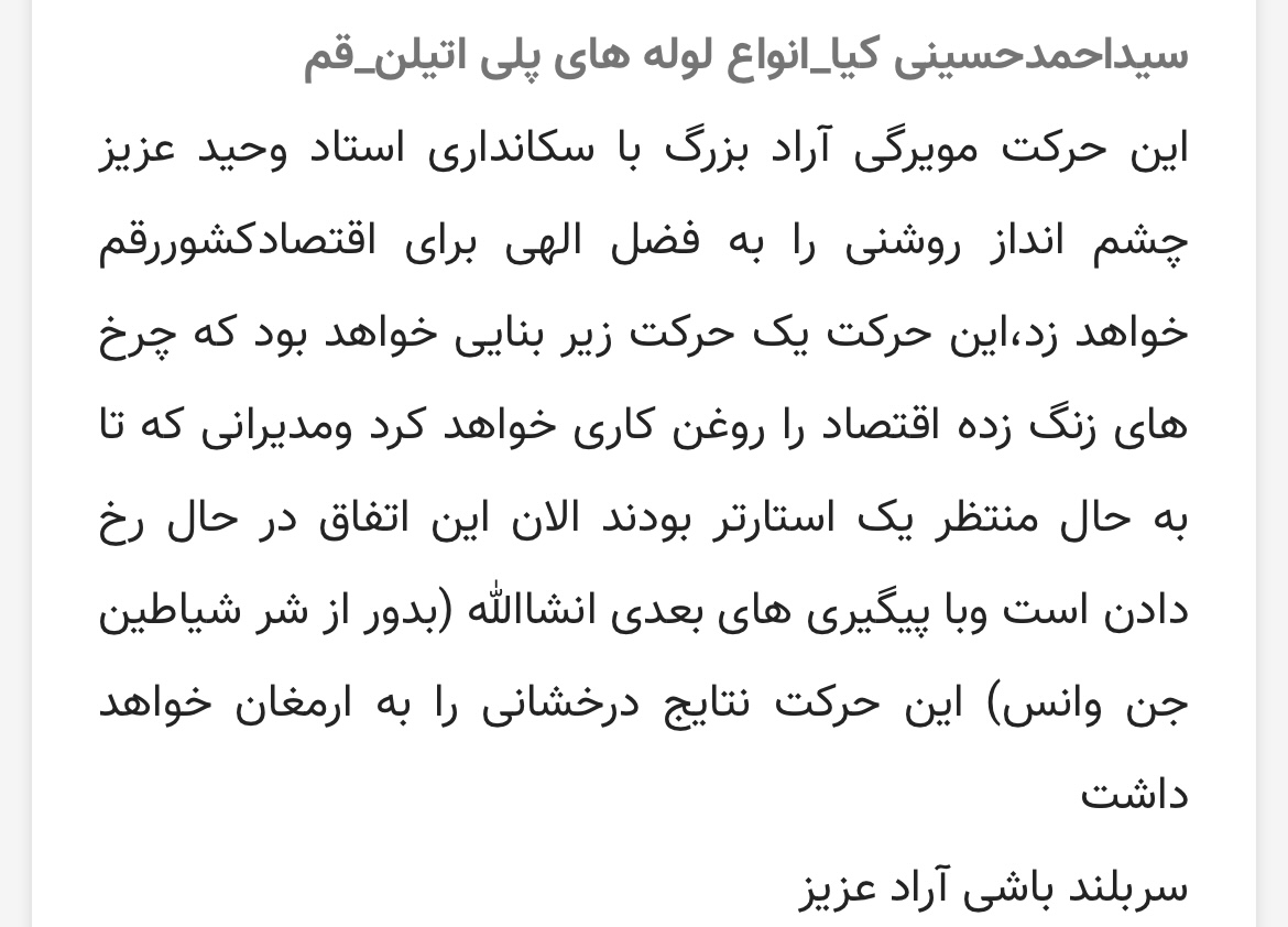 موفقیت های تاجران آرادی را تبریک عرض میکنم. اخبار ارسال محصولات به دیگر کشورها یعنی ارزش افزوده برای کشور ،یعنی استمرار تولید و ایجاد اشتغال ، خیلی ممنون از زحمات مدیران ارشد آراد که با صبر و حوصله توانسته آمد تجارت را در بین تاجران آرادی فرهنگ سازی نمایندو نتیجه این درخت ۱۸ ساله میوه های شیرین سود و پول است که شاهد آن هستیم.