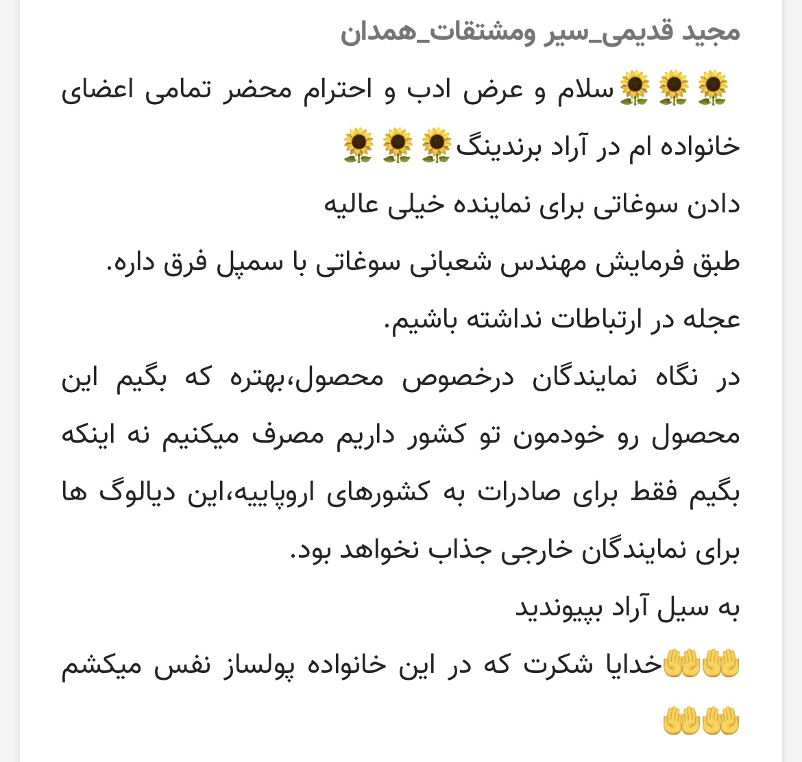 از فرمایشات مهندس شعبانی در ارتباط با نمایندگان خارجی شتاب زده عمل نکنیم محصولاتی که در اختیار داریم بهتر است خود رو به عنوان تاجر معرفی کنیم و برای معرفی محصول کشور خود رو معرفی کنیم که در داخل کشور مصرف زیادی دارد بیشتر مورد قبول است